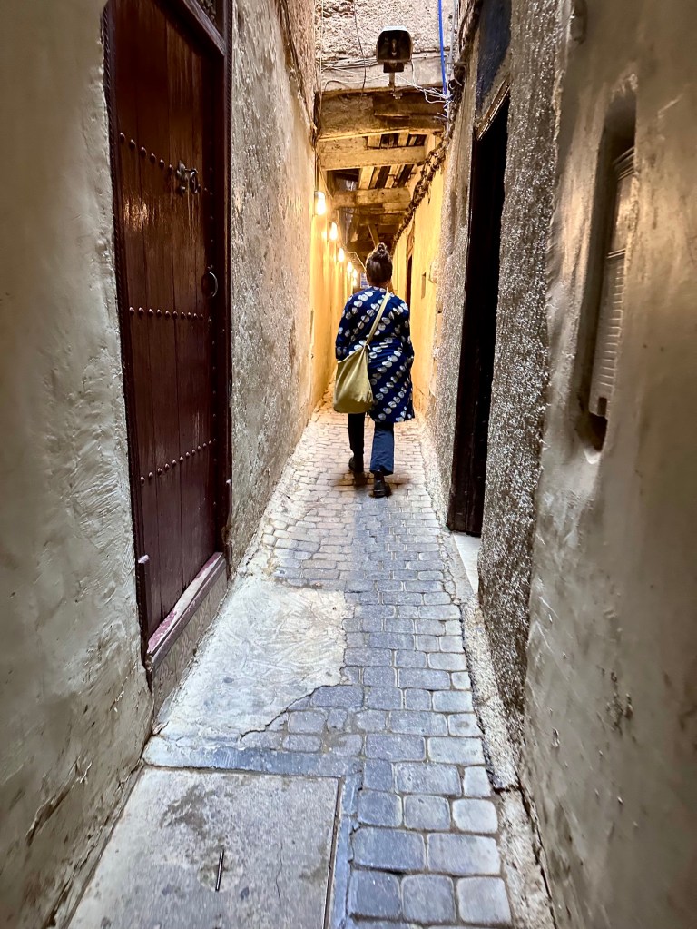 It was off a narrow main alley in an alley so narrow two people had trouble passing each other and even then when we got there we missed the narrow door and ended up in what appeared to be a beautiful carpet shop entered through another narrow doorway. But it was more than a carpet shop. It was a craft cooperative which we had happened upon by accident which guaranteed that 80% of the price of a carpet would go to the women who made the carpets and 20% to the cooperative for overhead with fixed prices. This unexpectedly solved two problems for me. One was that in the hundreds of carpet shops in the Fez Medina I would be in the hands of con men and would have to bargain without knowing what anything was worth and knowing that the women who made the carpets were also at the mercy of the of the shop owners and were lucky to get even 20% for themselves. So whatever I pay at Craft Cooperative, even if it was more than I would pay bargaining on the street, would go to the makers of the rug rather than the shop owner.