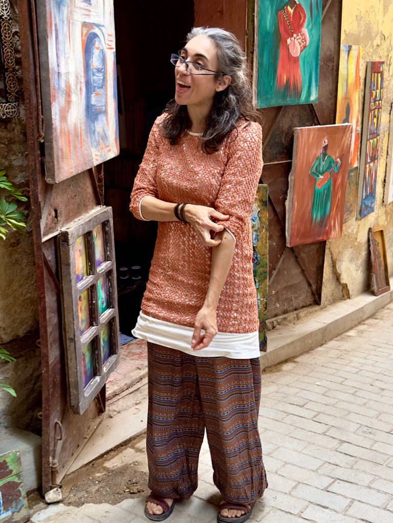 The other things that happened were when we turned left and found ourselves in alley after alley of blank walls with suddenly no tourists and no one else as well. Here we happened on a Spanish woman with a Moroccan husband, both artists, with all kinds of inexpensive earrings for sale. She spoke English and made us feel comfortable as Susie picked out earrings.