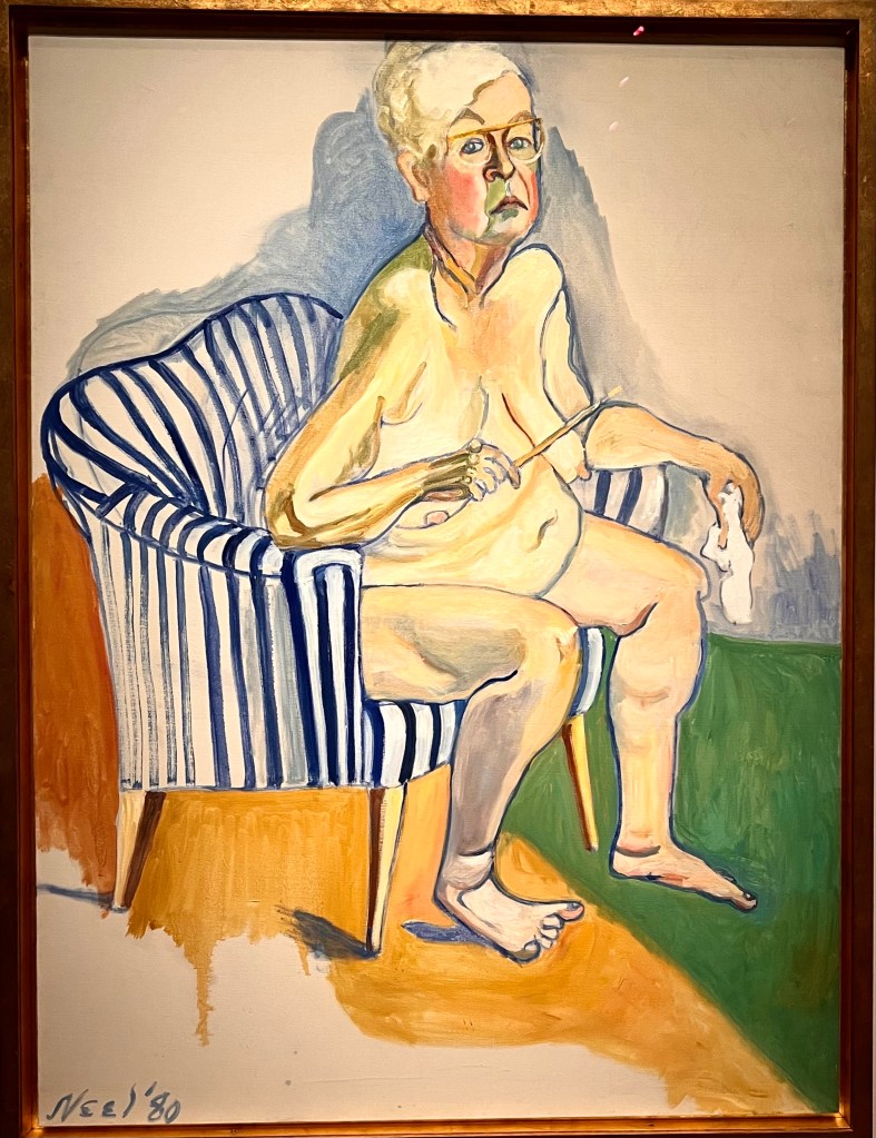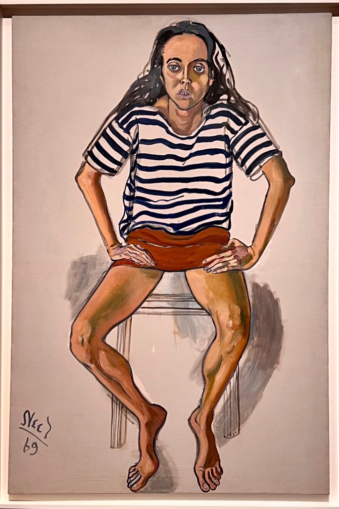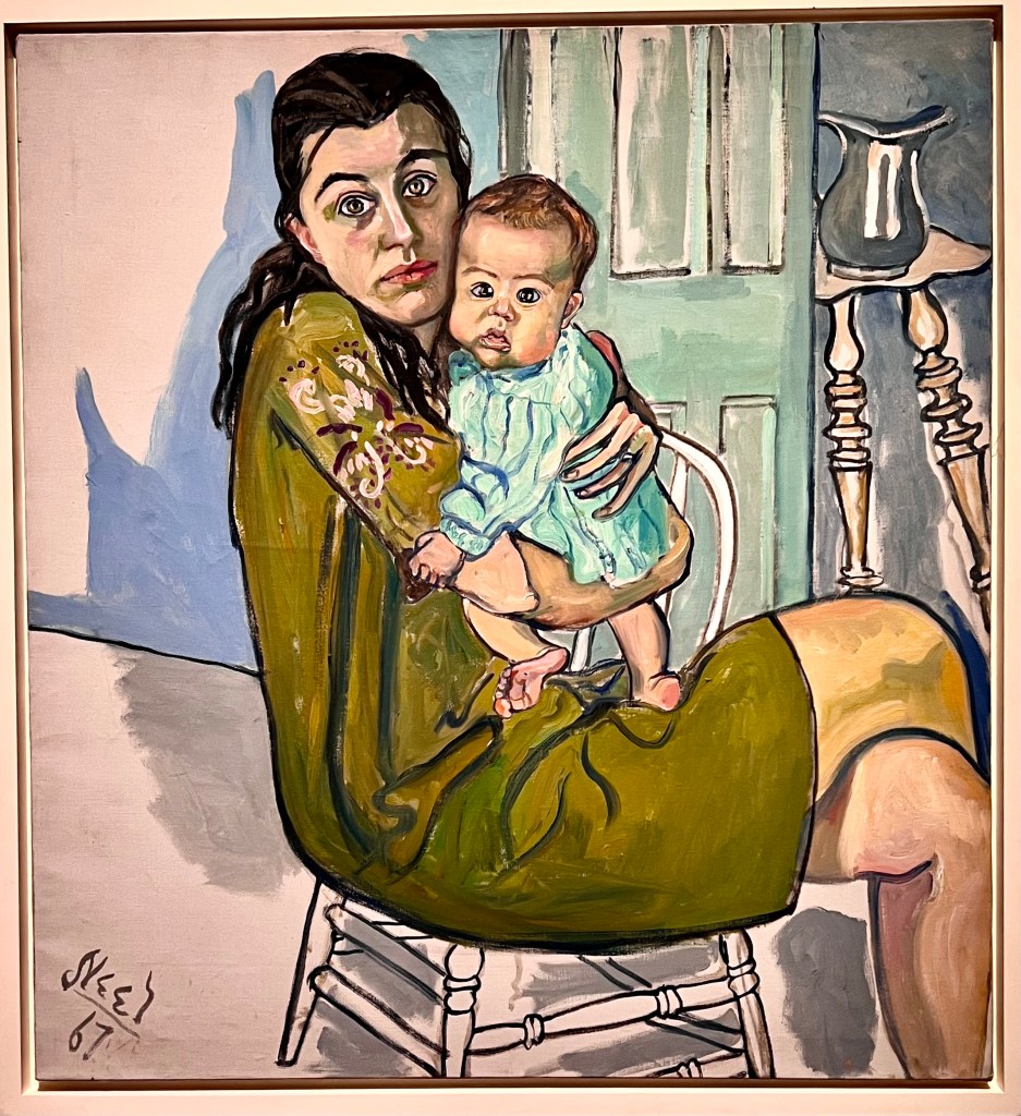 It is a cold, grey winter morning in Swannanoa and in Paris it is mild and raining hard. Since I am in both places at once it is a good time to be inside and luckily there is an Alice Neel exhibit at the Pompidou for us to visit at only $15 admission. I really like Alice Neel as a painter. She painted ordinary people in Spanish Harlem where she lived. A number of her paintings are female nudes, often pregnant, but nudes painted in a realistic style, not from a male perspective which she felt demeaned women. All of her paintings are of neighbors or relatives or friends. She gained little recognition during her lifetime. She died in 1984. But this current exhibit of over 100 paintings: Alice Neel: People Come First which is now at the Pompidou in Paris was in San Francisco this summer when I Amtraked around the country. So I know exactly what Todd and Susie are seeing and am with them. Susie just sent me a text photograph of a painting and I will add some of the photographs I took of the exhibit this summer.