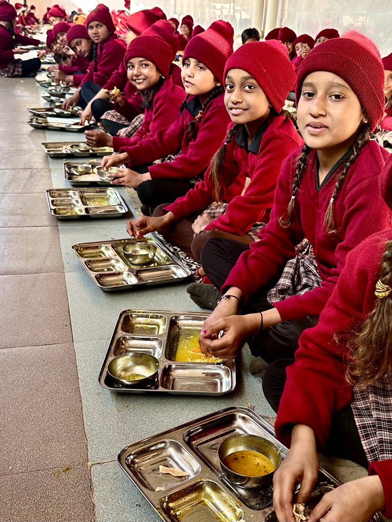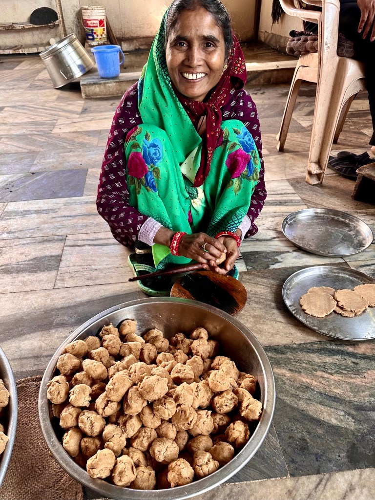 So that was my experience with cooks for missionary families. And it was only at the end of our visit in Virampur when I was taking photographs in the downstairs large kitchen beside a long hallway where the children would sit on the floor in long lines and ate their meals that I learned that Praveen, in addition to making us special meals upstairs, also was cooking for 150 children daily downstairs. With the help of a few women, the ones I gave blankets to earlier, he would cut up hundreds of eggplants and other vegetables, cook a huge pot of rice and make hundreds of flat thick round chewy bakra. He didn’t have to go to town to select the vegetables, as Madho did. A contracter brought in the daily required supplies and certainly provided a receipt. But it was a great deal of work to cook for two separate groups and certainly took Praveen’s whole day from morning to night.