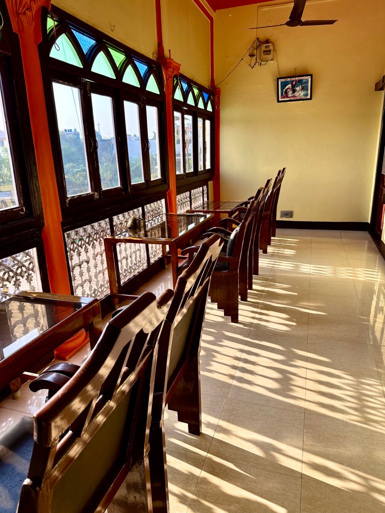 The United States seems like an oddly imagined place with very odd ways of doing things, but so does Varanasi with its horns and whistles and general cacophony. And neither of them seems more real than the other. Our hotel, the Sahi River View, two floors up with a wide glassed in porch and glass topped tables where I am sitting seems a step away from the hubbub of the street.