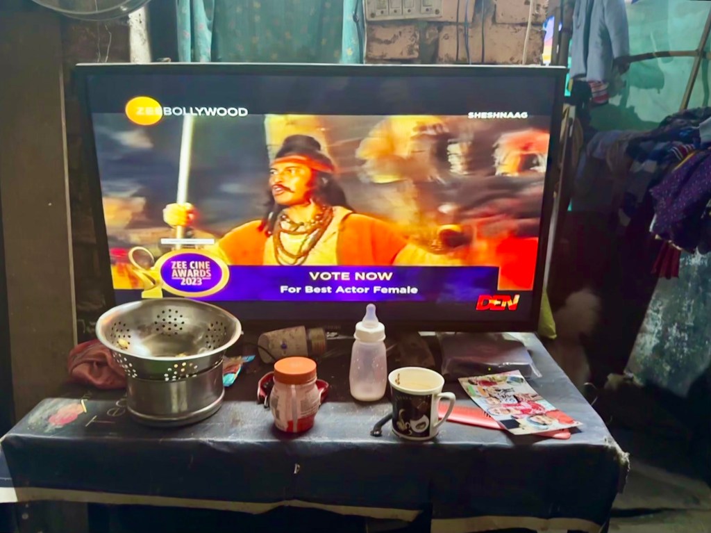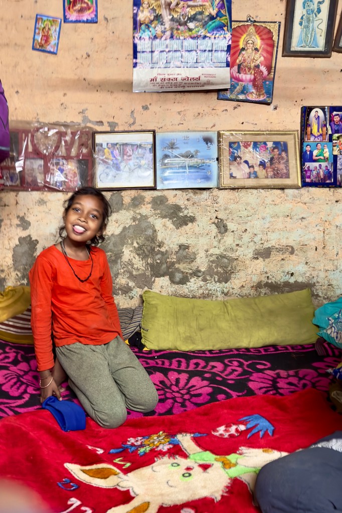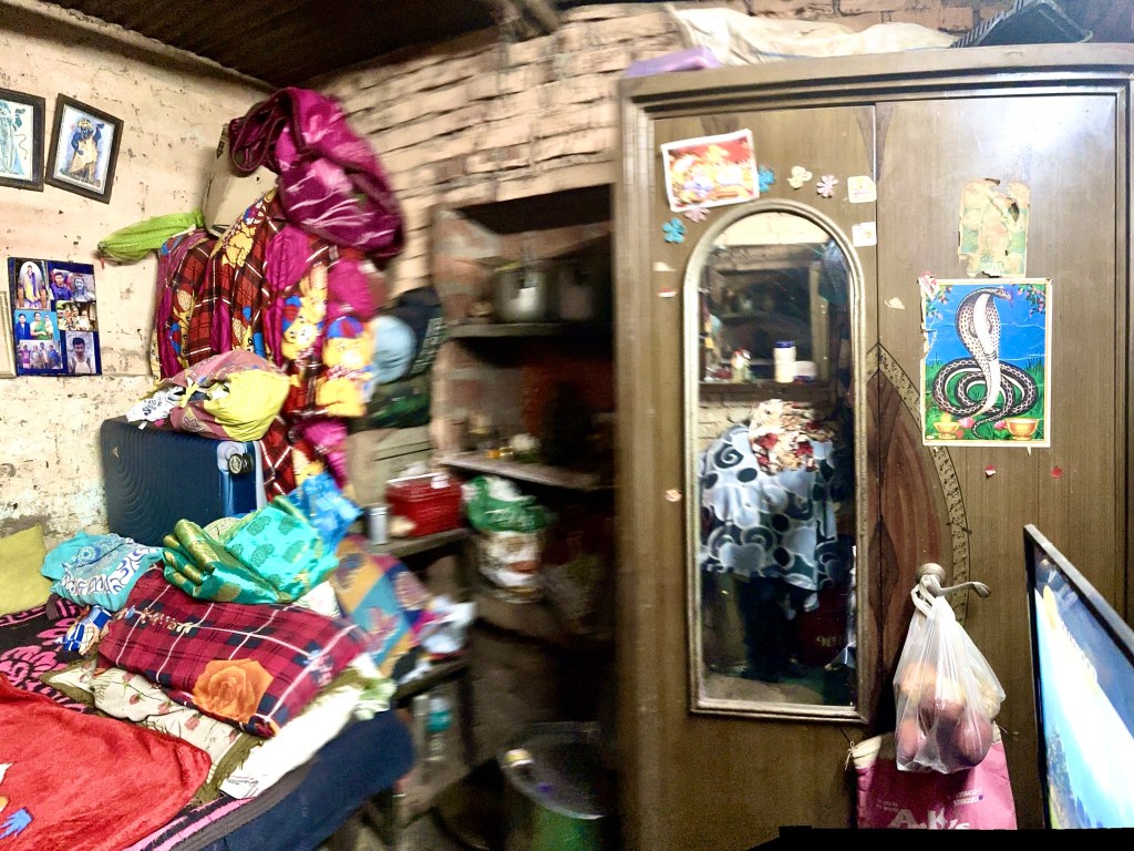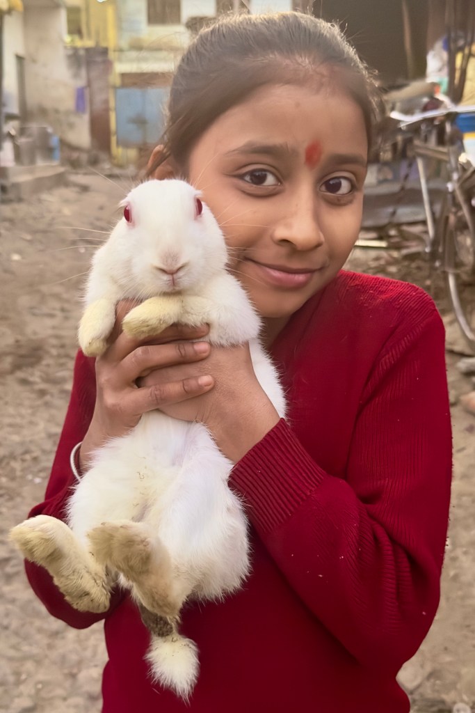 In the inner family room was a large bed in which everyone sleeps, an elmirah or wardrobe, where clothes were kept, some photographs on a shelf including the ones I had made and incongruously a second hand flat screen 30 inch tv on which a Bollywood film was playing. They also had cell phones. Also within the house were three pet white rabbits, two brown ducks, and a family dog all amicably sharing the space.
