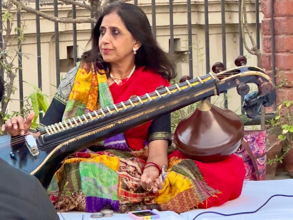 But on Monday and Tuesday there were a couple of concerts next door to our guest house which were marvelous. The first was in the Ganges River View, an old style hotel two doors down which I recommend to anyone visiting Varanasi for a few days. It is in the former spacious family home of the present owner who loves art and music. The main dining room is lined with miniature paintings and other beautiful artifacts. This room becomes a concert hall several times a year and on Monday we were invited to a concert. Most of the audience sits crosslegged on the carpet covered floor but I and Susie were there in time to get a chair. I can no longer sit crosslegged on the floor.