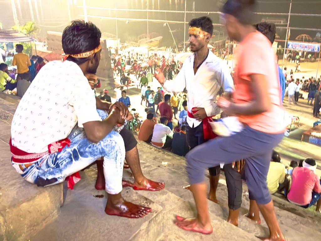 Two nights ago, on the night before Shiv Ratri a ritual pilgrimage by young men happens that we have asked about but don’t really understand. But this is what we have been told and what we saw. Thousands of young men in a continous parade make an all night pilgrimage from the Ganges at Desasvamedh Ghat where they bathe and then to the Golden Temple and then on to 12 other Shiva temples in Varanasi. The walk is said to be 100 kilometres or about 60 miles which doesn’t seem possible since they are all barefoot with their feet and lower legs coated with a red oily substance. They are said to be offered refreshments all the way along the way including plenty of bhang (pot) lassis. In any case they are high as can be, often shouting loudly and chanting and appear to be in a state of frenzied excitement as they walk rapidly, often bunched into tight groups as they squeeze through narrow gateways. The street below our guest house is filled with clumps of boys, with headbands on their heads and bright scarves tied around their waist, urging each other on as is the wide flat space at the top of the ghats just beyond our road in a river of boys that goes on and on and on.