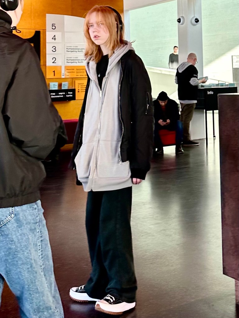 On Friday we walked to the Museum of Contemporary Art Kiasma housed in a large shiny metal clad building in the center of Helsinki. On the first Friday in the month it is free. It was also crowded with with people of all ages including lots of school kids. I took photographs of some of the art work and also photographs of visitors to the museum. What I was most struck by is the difference between the way I responded to people through my photographs and the way that contemporary artists respond to the world around them in either sculptures or paintings. I respond to people because they touch me viscerally in some way. I feel the presence of people and respond to them. It is a form of feeling and touching.