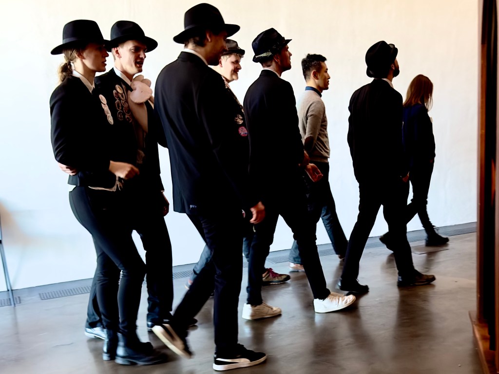 This painting with a number of letters and symbols is an example. The artist is not touched by these symbols and letters, instead the painting seems to me to be a statement about symbols and letters, an abstract and intellectual response. Instead of being concerned with feeling a response, the artists is making an intellectual response, instead of feeling, the art is concerned with meaning. Since I took photographs of the art work without reading the printed descriptions on the wall I have no idea what the meaning of most of the art work is. My feeling response to abstraction was to feel alienated and immobilized by most of the art. On the other hand, my photographs were entirely feeling responses. I was most intrigued by a group of men and women with broad brimmed hats and chains around their necks and medal like attachments on their jackets. Why they were dressed this way I have no idea but the strangeness of their attire attracted me.