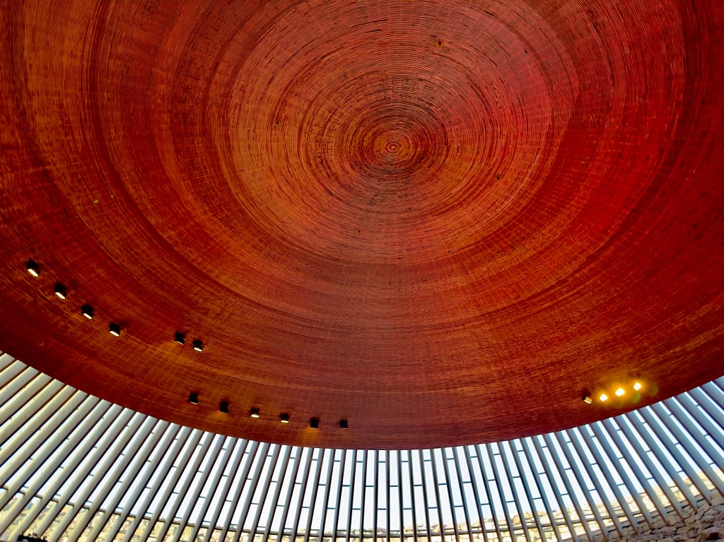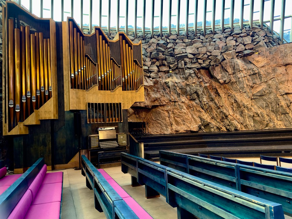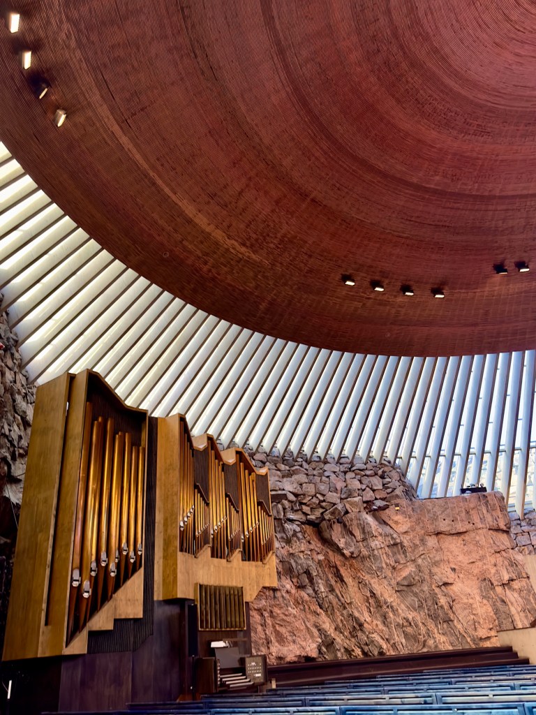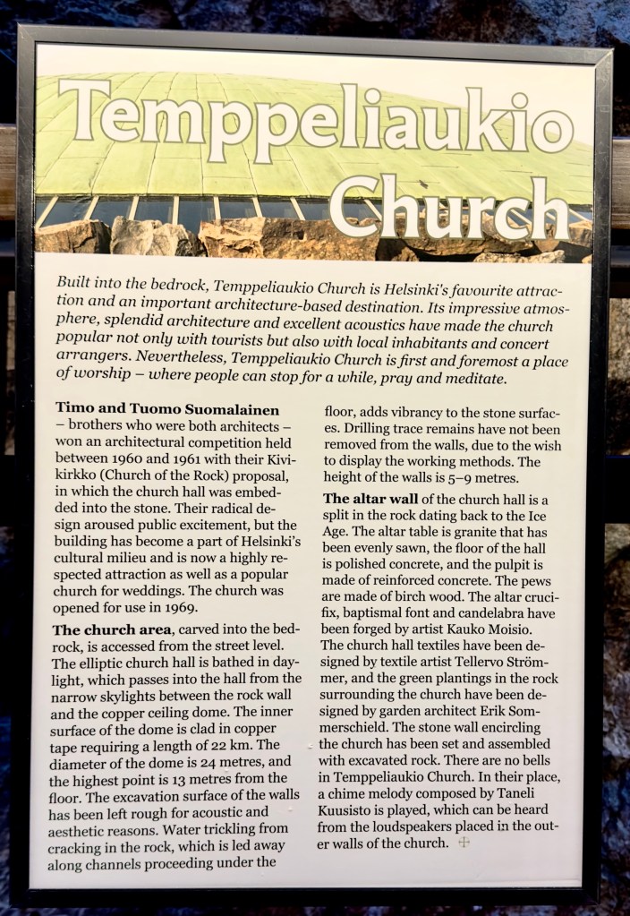 When we told Henny, Susie’s cousin who we are going to visit in Holland that we were going to spend five days in Helsinki, she said that she was in a choir that sang in an underground church in Helsinki. So after visiting the Contemporary Art Museum we stopped by to see the church since it was near the museum. The church, which is also used as a concert hall, is built half way underground in a circular rock enclosed space with a large copper ceiling. It is said to have marvelous acoustics. So we walked around within the space and took some photographs.
