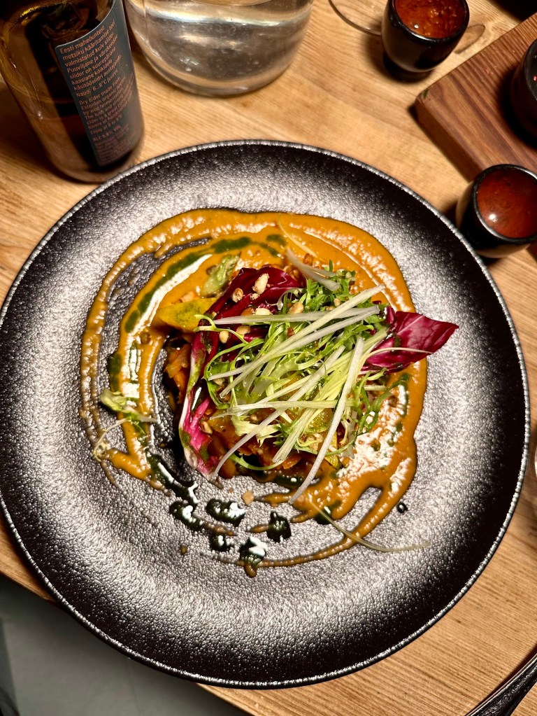 I got the most expensive thing on the menu, braised elk roast with oven-baked sweet potato, fennel, zucchini, onion, mustard and black currant sauce four 23.60 euros followed by a break pudding which we shared. I‘ve never had elk roast before and had to try it.