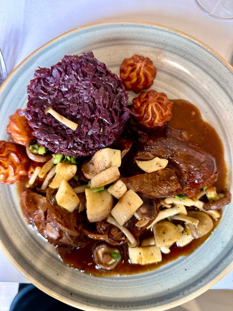Saturday’s visit began with a sumptious dinner at Jann Hinsch Hof, an elegant hotel and restaurant just behind the Realschule. I had the special of the day, a marvelous wedding soup followed by roast venison with sweet red cabbage and beautifully browned potato puffs.
