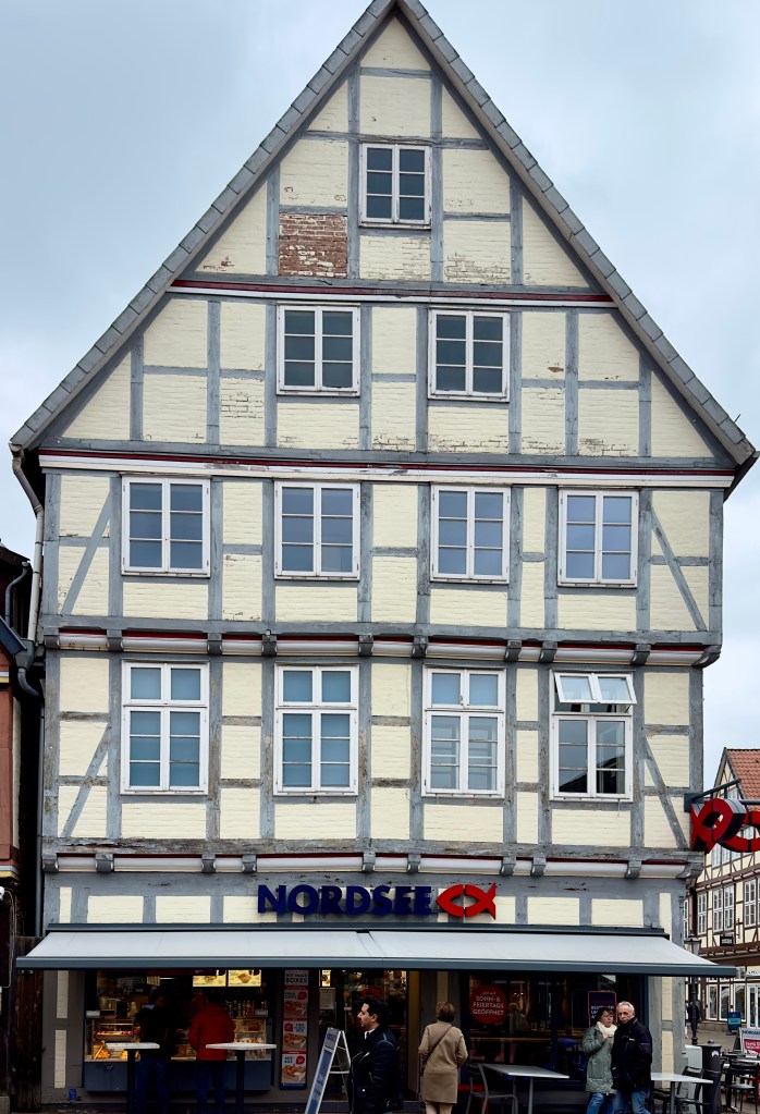 Celle was the birthplace of the Hanoverian kings who became kings of by England: George I, II and III of revolutionary war infamy. So during World War II the British insisted that Celle not be bombed. So while nearby Hannover was flattened, Celle stayed untouched and is now a beautiful old town. The original exteriors of the houses have been beautifully maintained, while the insides of the houses, now boutique shops, have been completely modernized. So we walked around Celle for two hours marveling at the old houses.