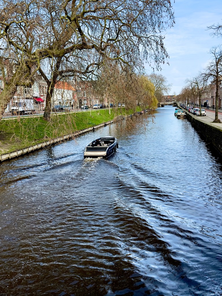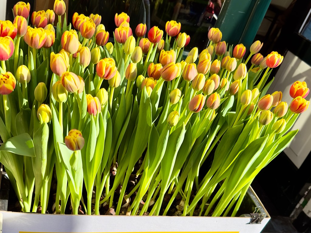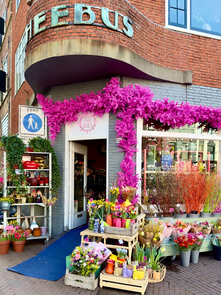 Today we went on a long walk around Haarlem, which doesn‘t seem to be a huge town, at least the downtown commercial section, often in older buildings. Here was a mixture of the beautiful facades on pointed buildings from Vermeer paintings, the constant canals and vivid tulips, along with modern Haarlem. It is a marvelous town to be in for the next two weeks. Here is some of what we saw as we walked.