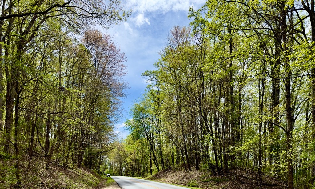 If the dunes national park outside of Haarlem is thousands of acres, the Blue Ridge Parkway, also a national park must be millions of acres, 500 miles of park stretching from the Smoky Mountain National Park, a huge park itself and the most visited of all American National Parks almost all the way along the crest of the Appalachian Mountains without a gas station or a strip mall or a convenience store or hardly even a house in sight during the leafy summer to Washington, DC, a full day’s drive. Somehow I am so used to the protected spaces here in the United States that I hardly notice them. But there I was with the yellow green leaves budding and forest everywhere, not a carefully managed crop that is clear cut when fully grown, as in Germany, but wild with trees rotting where they fall, returning to being an old growth forest. If I had continued South for 30 miles I would have gotten to Mount Pisgah with views past mountain valleys far across the plains of North Carolina and if I had turned around and driven north for 30 miles I would have climbed to the top of Mount Mitchell, the highest point in the Eastern United States. In either direction the trees and flowers would have changed until I was among the woods of Canada with the present Canadian plant and animal life left on these mountain tops after the glaciers of the ice age that had pushed south retreated to the far north.