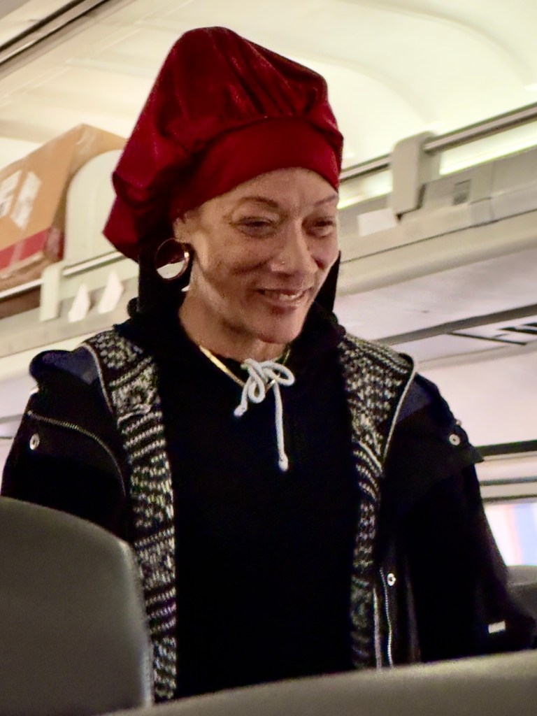 We caught the train. We had comfortable seats but the windows were so glazed with spatter that it was almost impossible to see out and certainly impossible to photograph through. The one photograph of the trip was of a woman/man with a marvelous cackle who roamed the aisle in loud conversation with whoever would talk with him/her. We slept, read, ate the food we had brought with us, wandered the Internet and passed the time.