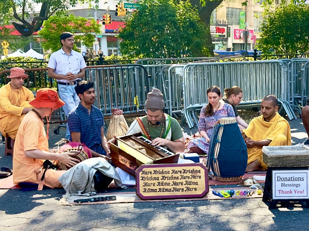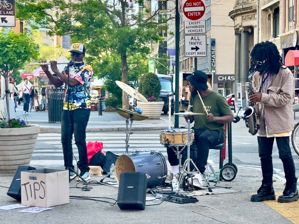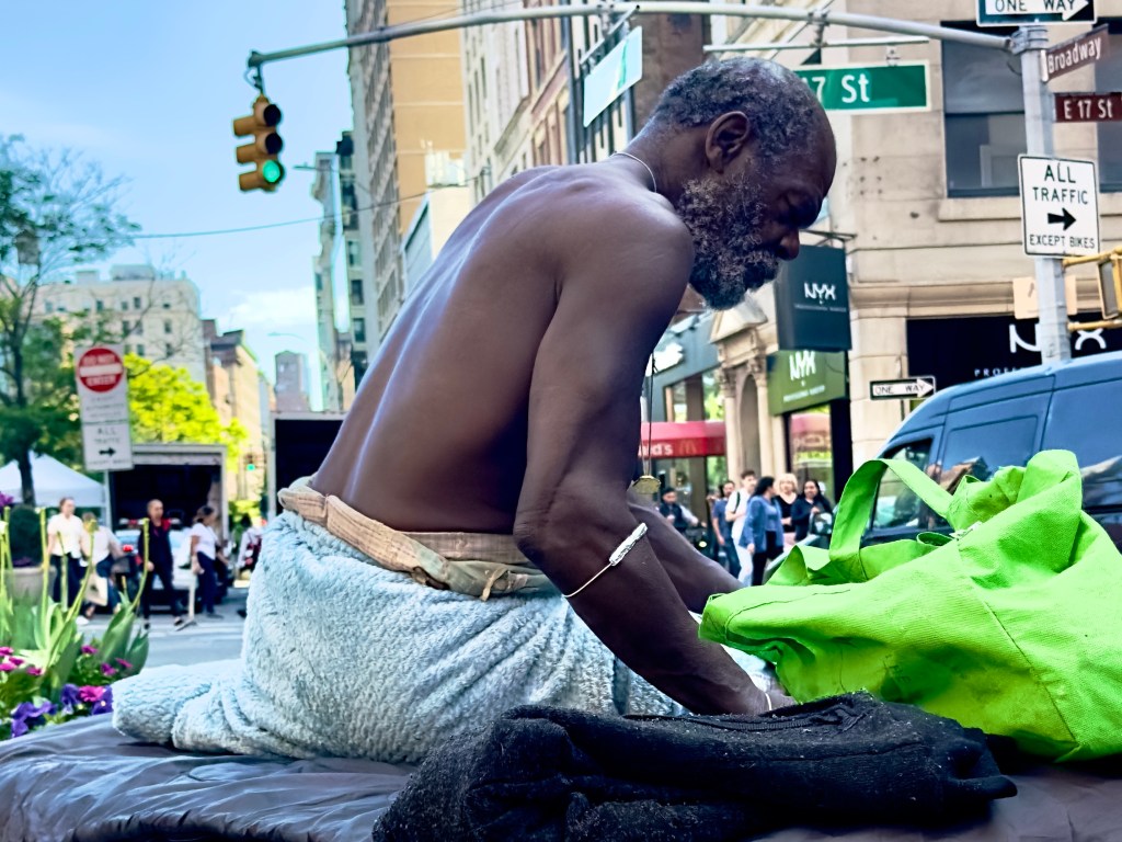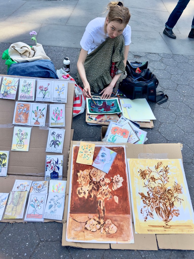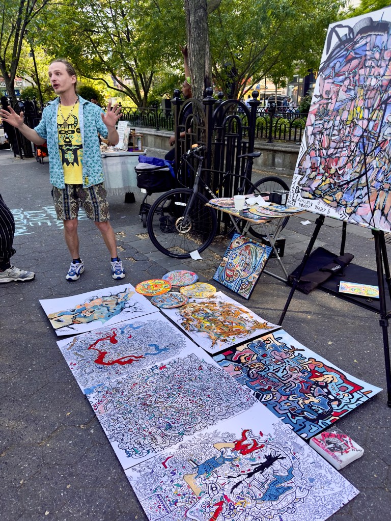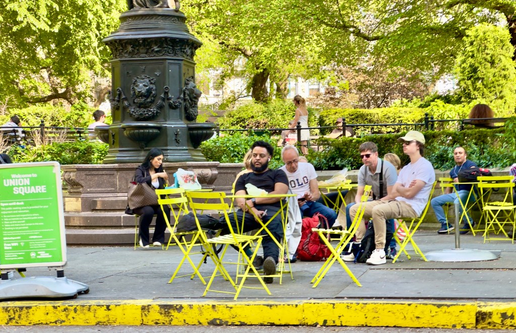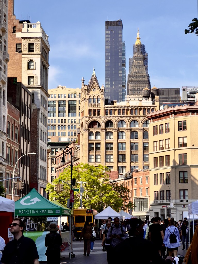 But that was only half the day. By the time I got back to Penn Station I was worn out. Susie met me and we walked to Union Square. There were fold out yellow metal tables and chairs all around Union Square for people to sit at during the late afternoon and vendors of all kinds selling stuff around the park and a band. For two hours we sat there and watched people walking by.