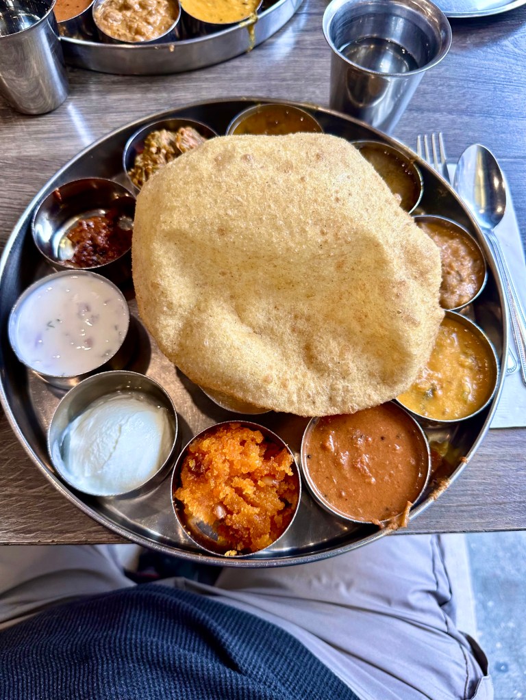And then to top off the day we went to nearby Saravanna Bhavan, our favorite South Indian restaurant in Delhi, a chain, that I have eaten at in Paris and in three different locations in London where we had a South Indian Thali, a round plate with puries and rice with a circle of ten different side dishes including curd and a dessert. And then, satisfied we went back to Leeann and Tony‘s place and fell asleep.