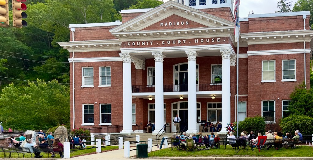 All these signs of change were opposed by a gathering on the lawn in front of the old Madison County Court House a sparse crowd of mostly older folks who sat in folding chairs as they sang hymns and and listened to a preacher on the courthouse steps thunder against sin. We only heard a little of his speech, a few sentences about the threat of people choosing to be homosexuals and the blasphemy of people thinking they could change their sex, all proscribed by the Bible, with nothing about love your neighbor as yourself. It reminded me that Sodom was close by, a mountain community just outside Marshall, named, I presume for the original Sodom, home of sinners, of Sodom and Gomorrah infamy.