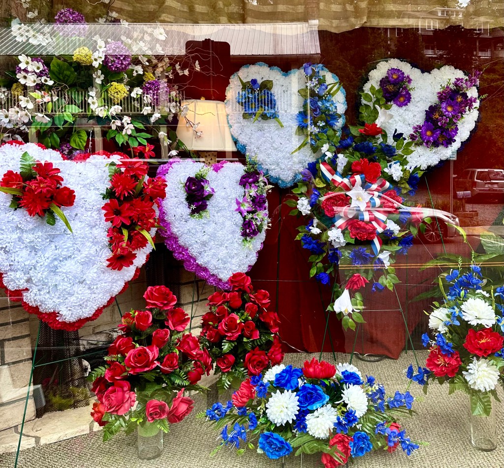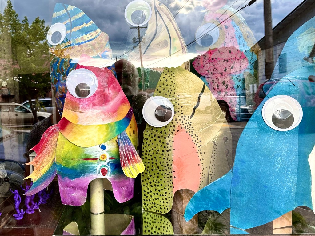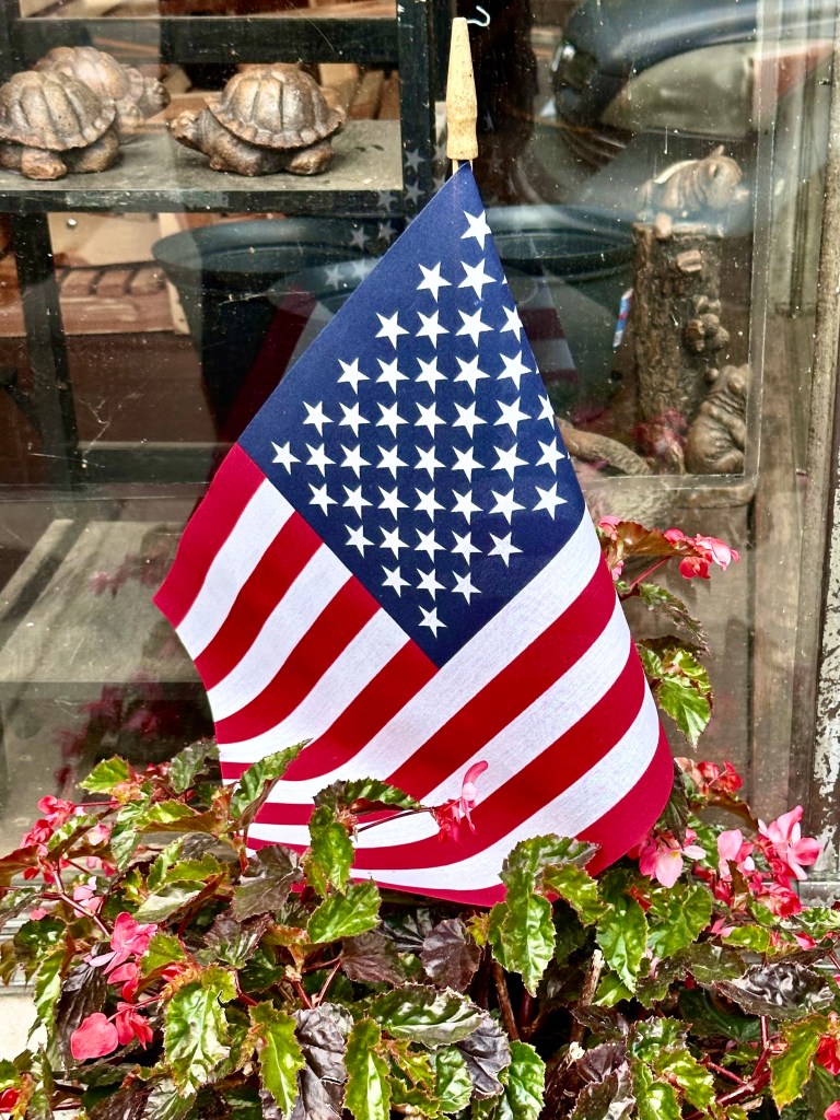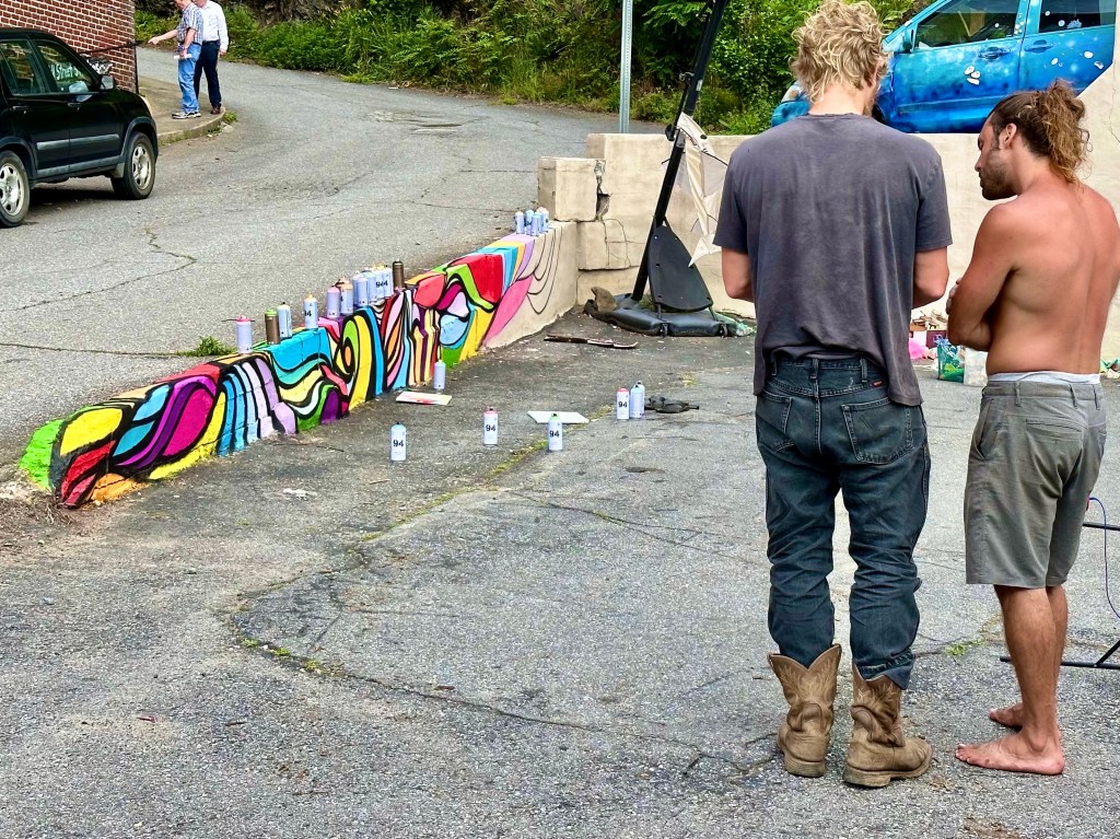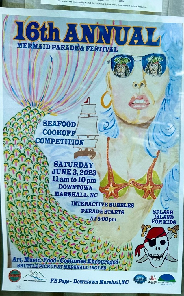 On Main Street lined with American flags honoring Memorial Day was a fake red, white and blue flower display honoring traditional values and Penland’s, an old fashioned hardware store frozen in time, that fifty years ago was an ordinary country hardware store. There were posters for the Mermaid celebration and parade coming on Saturday when people from all around would dress in ridiculous and scanty mermaids and pirates outfits with blowing bubbles replacing the water guns of previous parades. It signals the exuberant, joyfulness of the newcomers to town with men dressed as mermaids and women as pirates. The old jail, just down the street from the court house is now a combination hotel in the old jail cells with an upscale Jail cafe downstairs where I sat with Susie and had a smash burger and salad. The railroad still runs through town, but it is all freight now, with the old Depot now an upscale restaurant. Madison County used to be dry, but now has several small breweries and restaurants. The owner of a tattoo parlor painting his parking lot in bright colors. We met and talked with an old friend, Snakehawk, a refugee from a former respectable life with a respectable name, about to move to near Cancun, Mexico to stretch his Social Security payments.