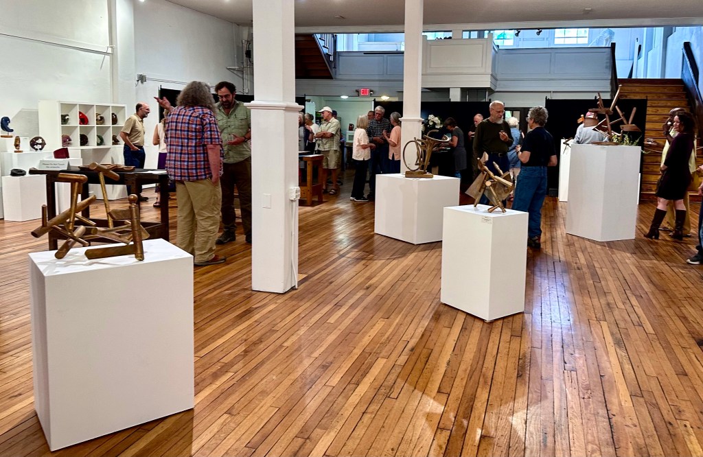 On Wednesday afternoon I drove to Marshall, half an hour from Asheville for an exhibit by a woodworker, Drew Langsamer, at the refurbished Madison County Arts Council display area on Main Street. The woodworking show which featured wooden chairs taken apart and reworked into art objects was interesting and the variety of people who were there at the opening also interesting. This seemed to be the creative community of artists who have moved recently to Marshall celebrating their own.
