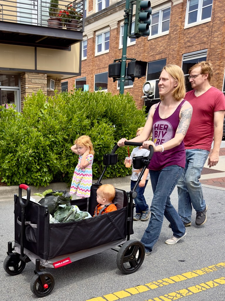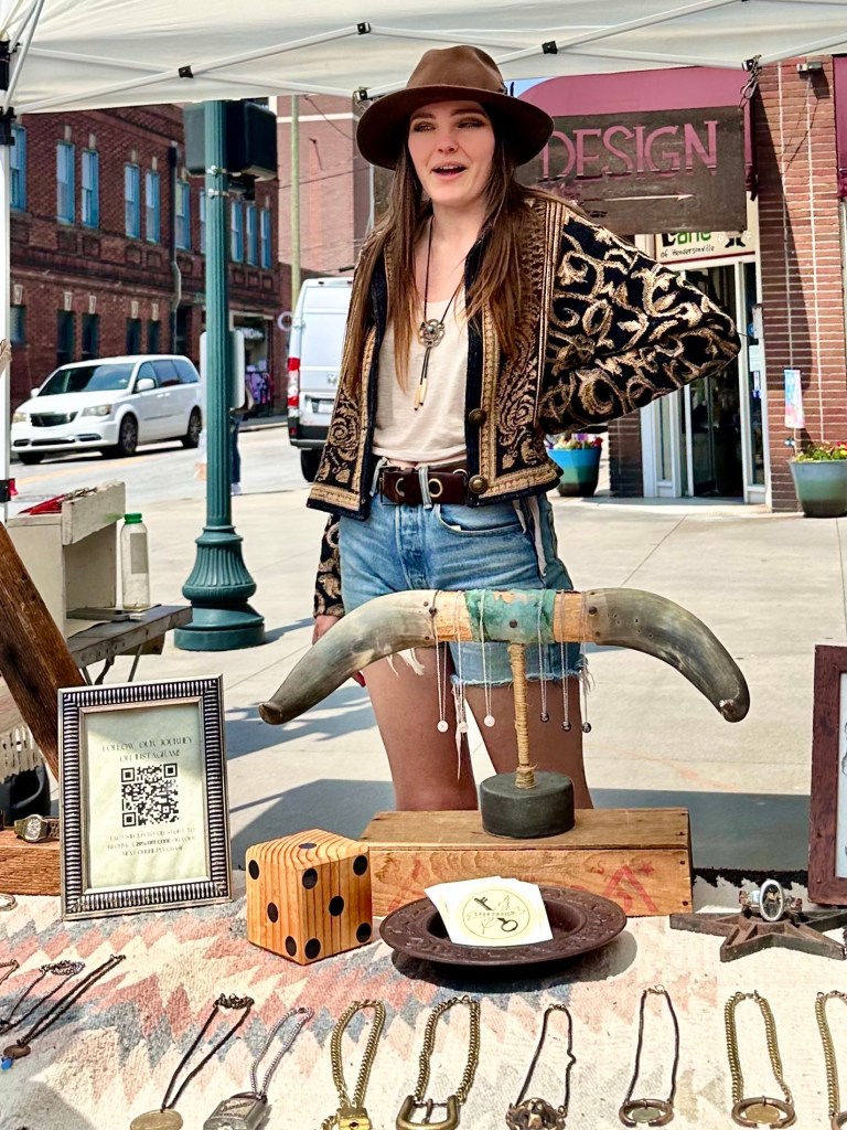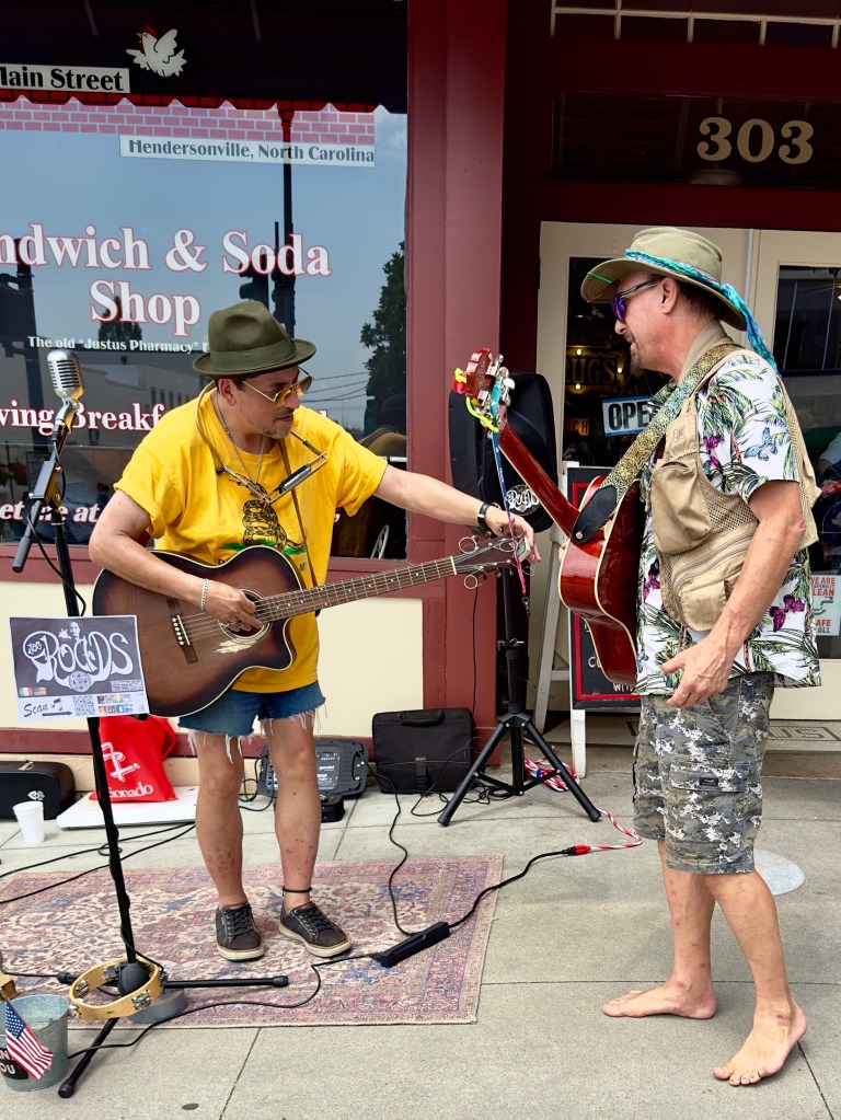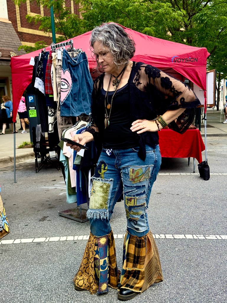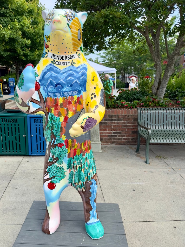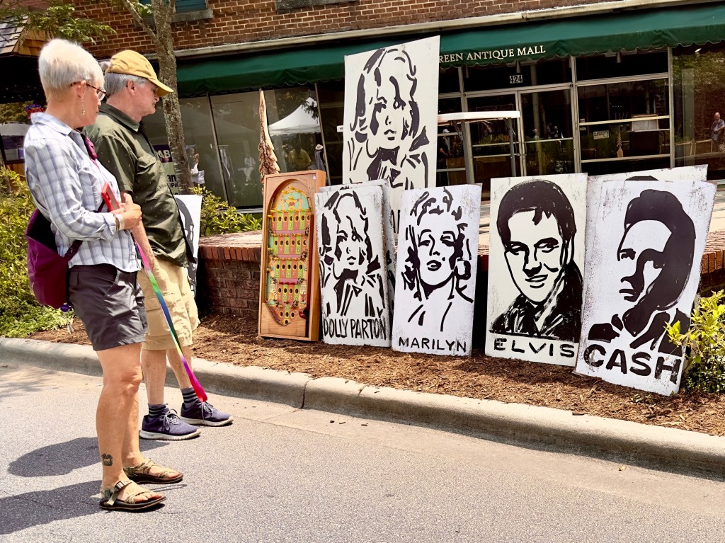 Saturday I want to the Uncommon Market in Hendersonville, an hour‘s drive from Asheville. I hadn‘t been to Hendersonville in a while since some time before the pandemic. The Main Street was blocked off and the tents of the Uncommon Market stretched all the way down Main Street to the courthouse. Hendersonville is a county seat, home to many retirees who vote conservative. Our Republican congressman, Edwards, is from Hendersonville. At one point Hendersonville, like Marshall, was where people when on Saturday to shop for basic provisions. Now it is entirely a tourist town with a wide array of restaurants, including a new Indian restaurant with an $18 buffet, almost empty with two Indian families inside. There are a number of resale shops and lots of art galleries and many stores selling tourist items and souvenirs. I don‘t think the Saturday market on Main Street had brought people from very far except for the normal tourists and people who lived in Hendersonville. It was not crowded.