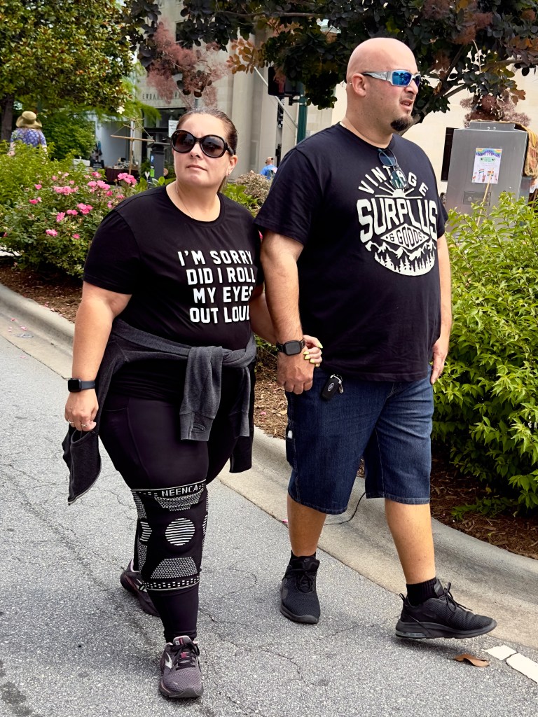 Tourists had on informal holiday clothes, often T-shirts with a statement of one kind or another. I only stayed an hour since I couldn‘t figure out the online parking system which only gave me a half hour.