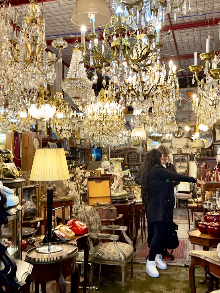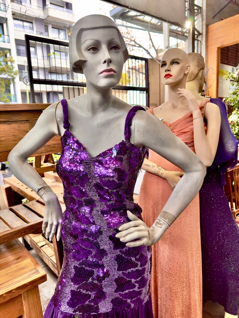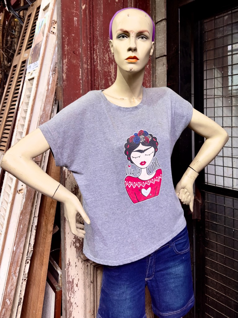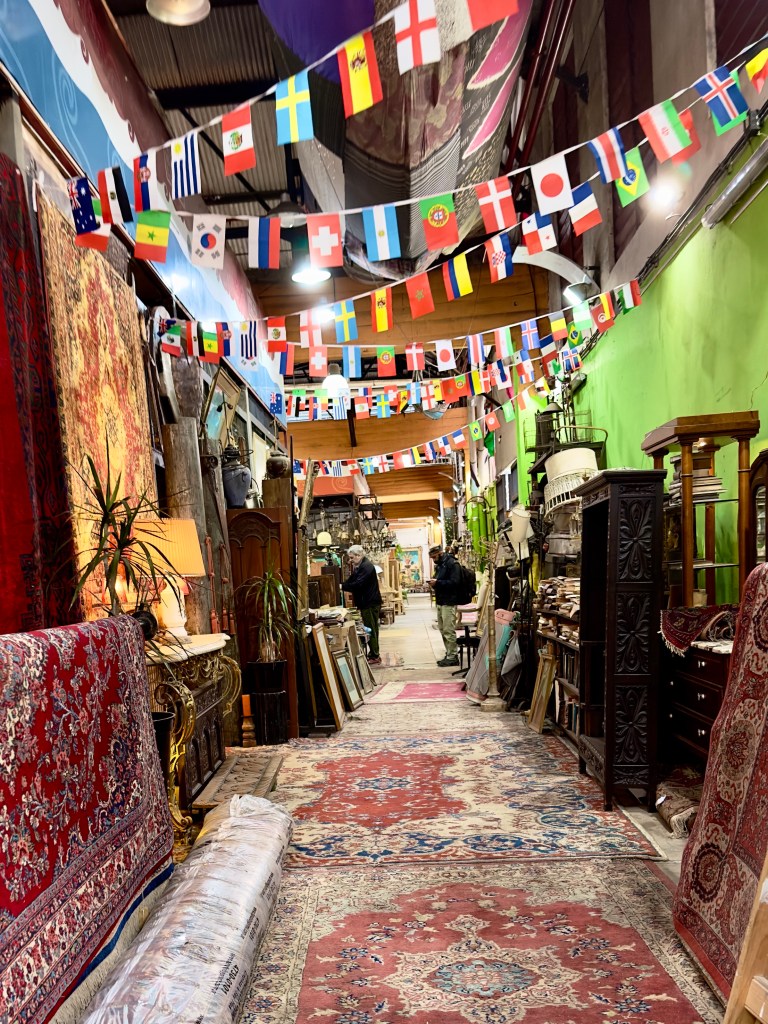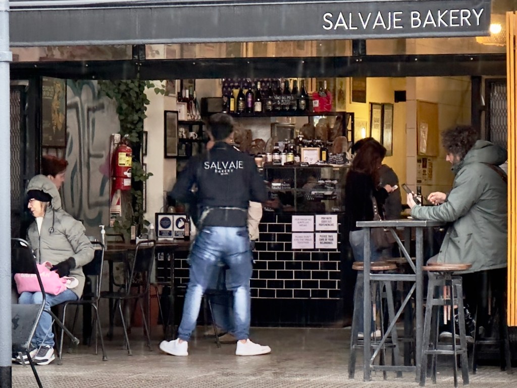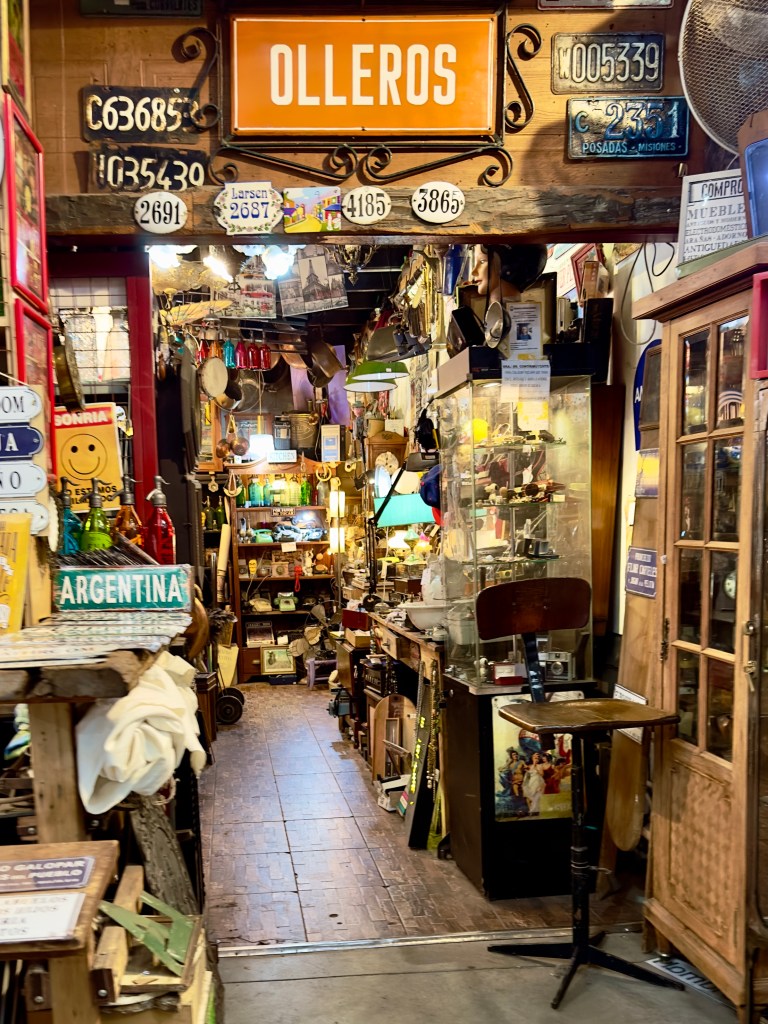 My first day in Buenos Aires rain was predicted. I didn’t have an umbrella. I had also learned that the electrical plugs are different in Argentina than they are in Uruguay. All my devices were running out of power and I needed the QR code on my iPhone to even get back in the building. The very first thing that I had to do on a Sunday morning in the upscale Palermo area was to get an umbrella and an adapter plug. According to my host’s information there was a nice cafe, Salvaje, near a flea market. I thought a flea market would have an umbrella. So off I went for what turned out to be a mile walk to the restaurant. I learned that while Palermo Hollywood has an upscale restaurant about every 50 feet, so I wasn’t going to starve, there was nothing resembling an umbrella store. There were no grocery stores, either, which was my third priority. I walked and walked. But I saw a Japanese man putting stuff on a shelf in a small store and took a chance on him. He didn’t understand English but when I pantomimed an umbrella, he had one, and when I showed him the American plug I had brought along he had an adapter as well.