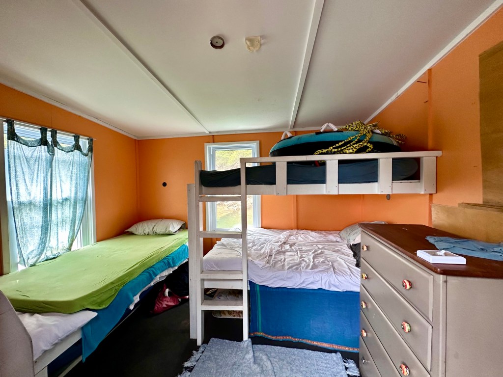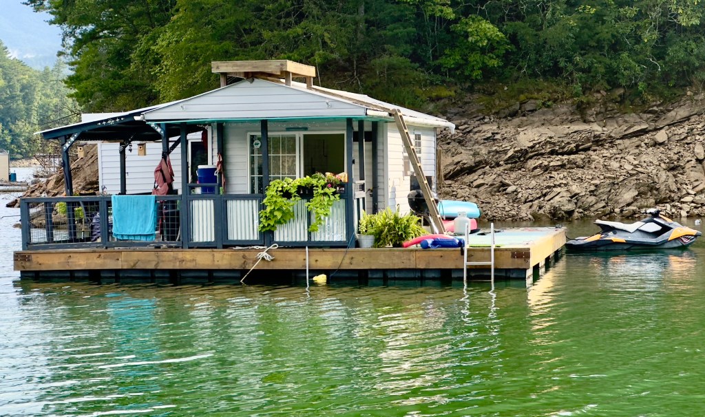 People don’t have houseboats as an inexpensive place to stay. Because the lake is drained in the winter no one can live there year around anyway. The houseboats are cramped and are obviously just a a getaway place in the summer. There are strict rules about the height and square feet of every houseboat. There is no heating for the winter in any case. There is no plumbing so the toilet waste has to be emptied and brought to shore and disposed of somehow. There is no electricity, so everyone has solar panels on the roof. There are no grocery stores anywhere close. In order even to get to your houseboat you need another boat to go back and forth on. Joanna and Jamie have a very nice pontoon boat with a large motor with very poor gas mileage. You are really remote here. You can’t go back and forth to work. For Jamie and Joanna Asheville is an hour and a half away.