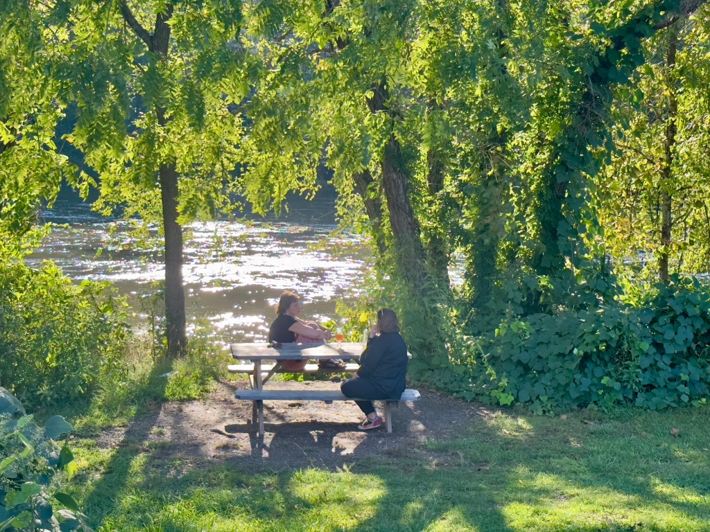 And it turned out to be a wonderful place. It was a beautiful golden afternoon. We sat outside at a picnic table while a band, The Bear Street String Bandits, played mountain music. The Filipino Master BBQ, chicken and rice in a hot sauce, was delicious and the band lively. People were scattered on picnic tables all the way down to the river. I think most people were there for the music.