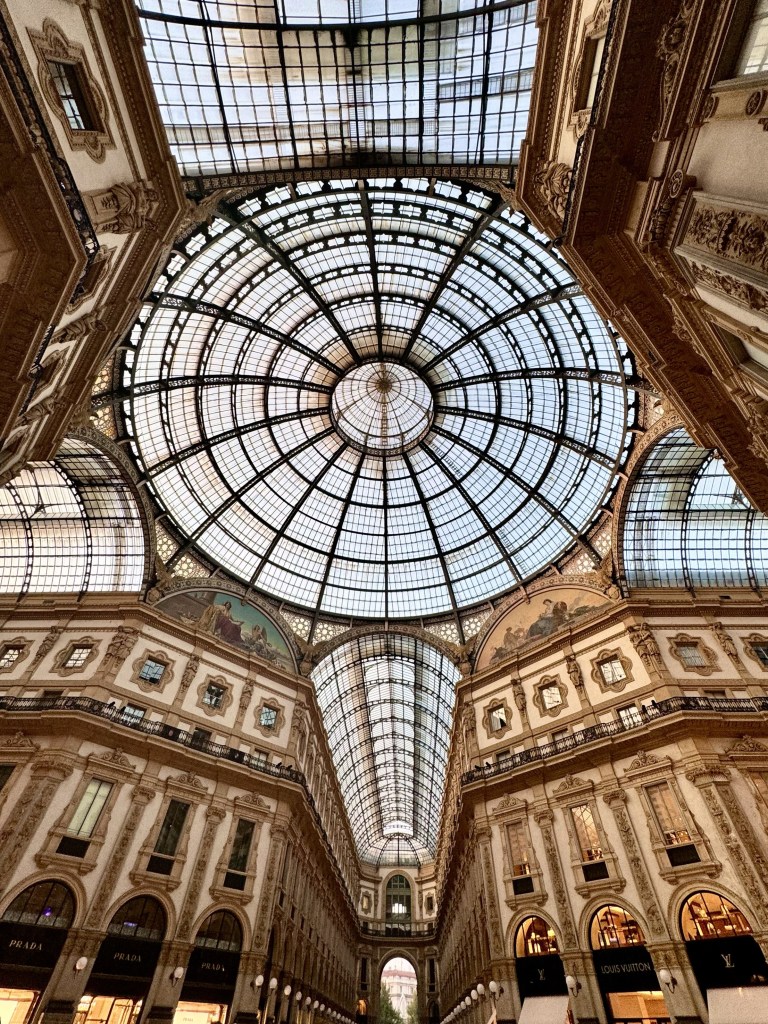 I was in Milan for a night before flying on to Catania, Sicily. My expensive hotel was partly expensive because I wanted to be a short walk away from the Duomo area of Milan. So all I saw of Milan was the large square in front of the Duomo and the Tiffany style glass topped arcade of the very elegant shops directly beside it.