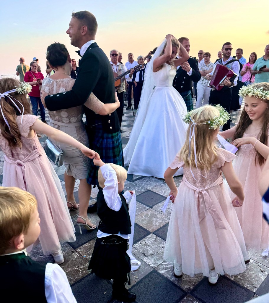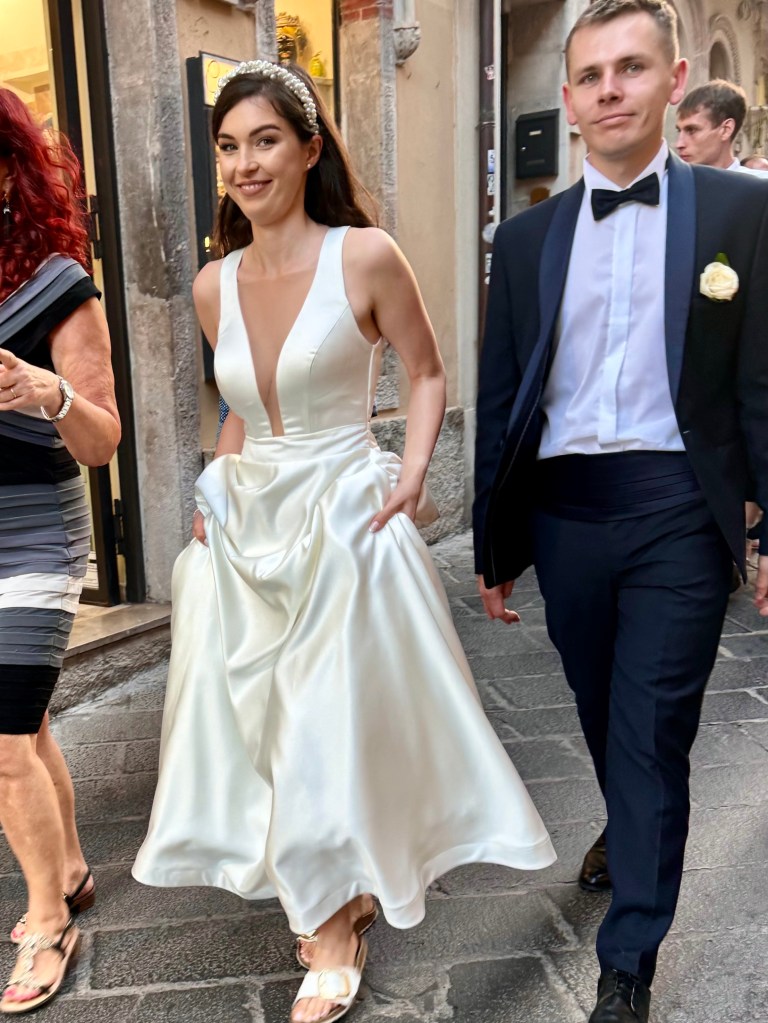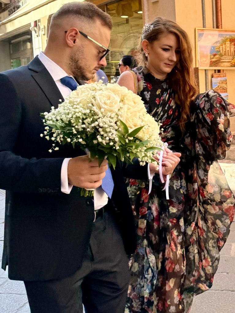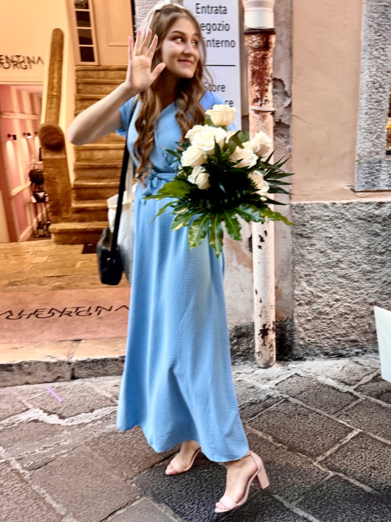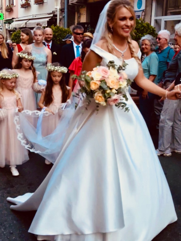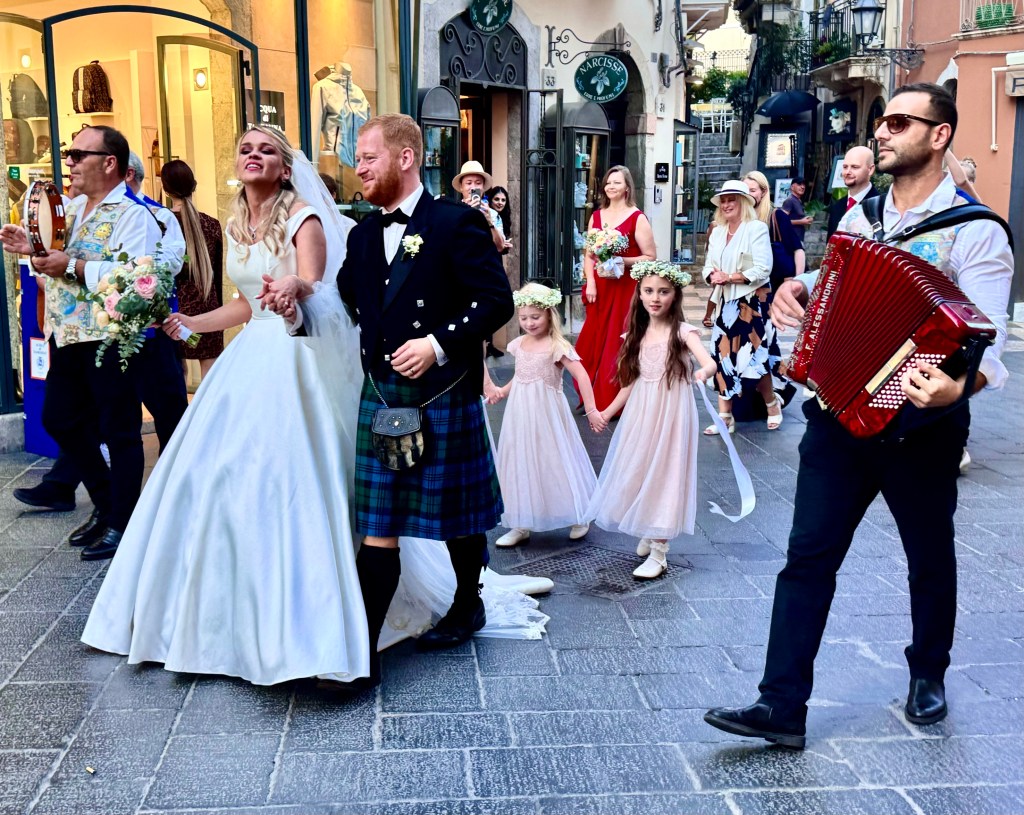 On the way back I ran into a wedding party as they made their way up way up Umberto Corsa with three singers play a guitar, an accordion and a drum leading the way. Tourists, including me, were delighted and took photographs and clapped and then the party got to the wide space in front of a church with a view out over the Mediterranean the band played and sang, the surrounding tourists sang along and the bride and groom and the whole wedding party began to dance. It was a wonderful afternoon.