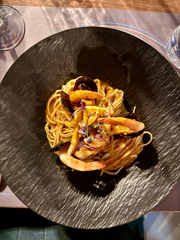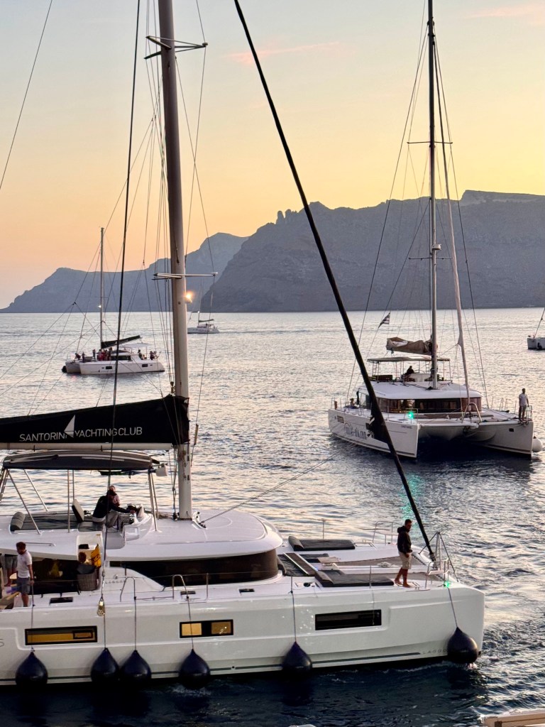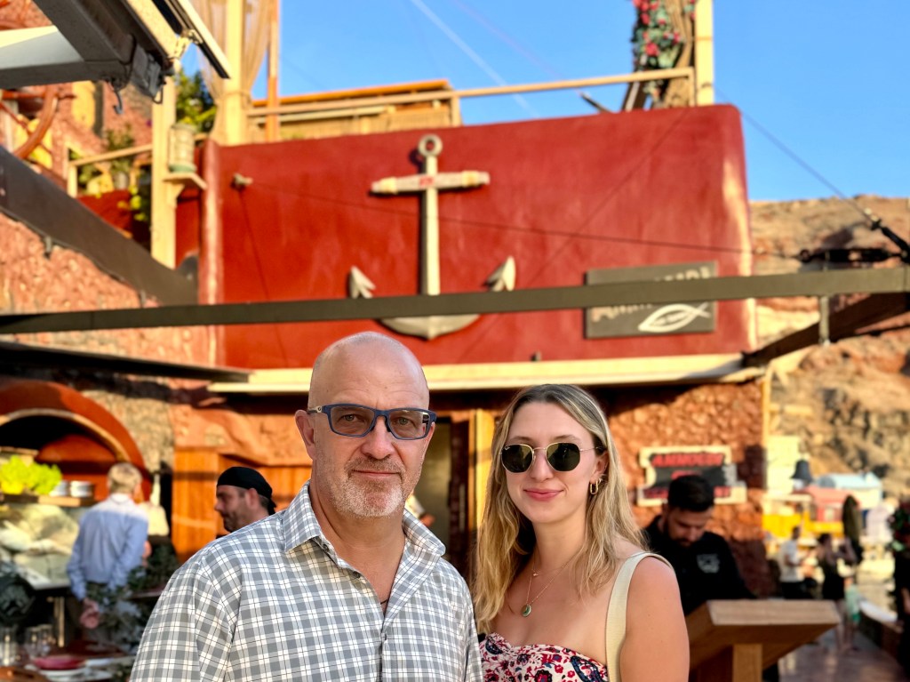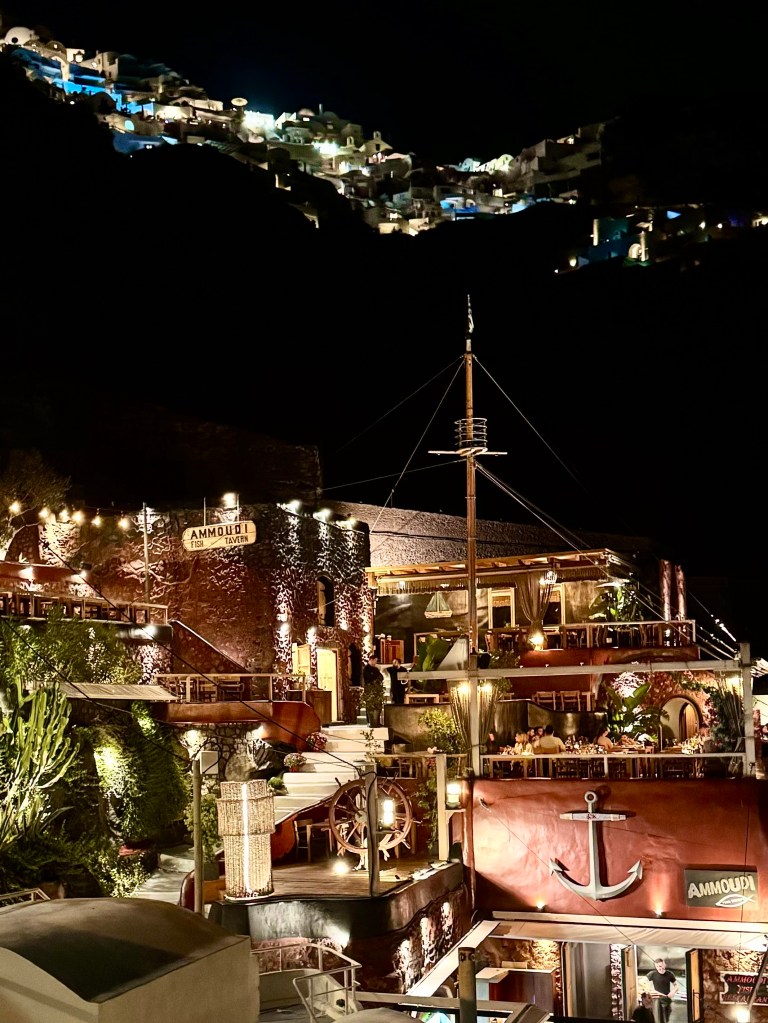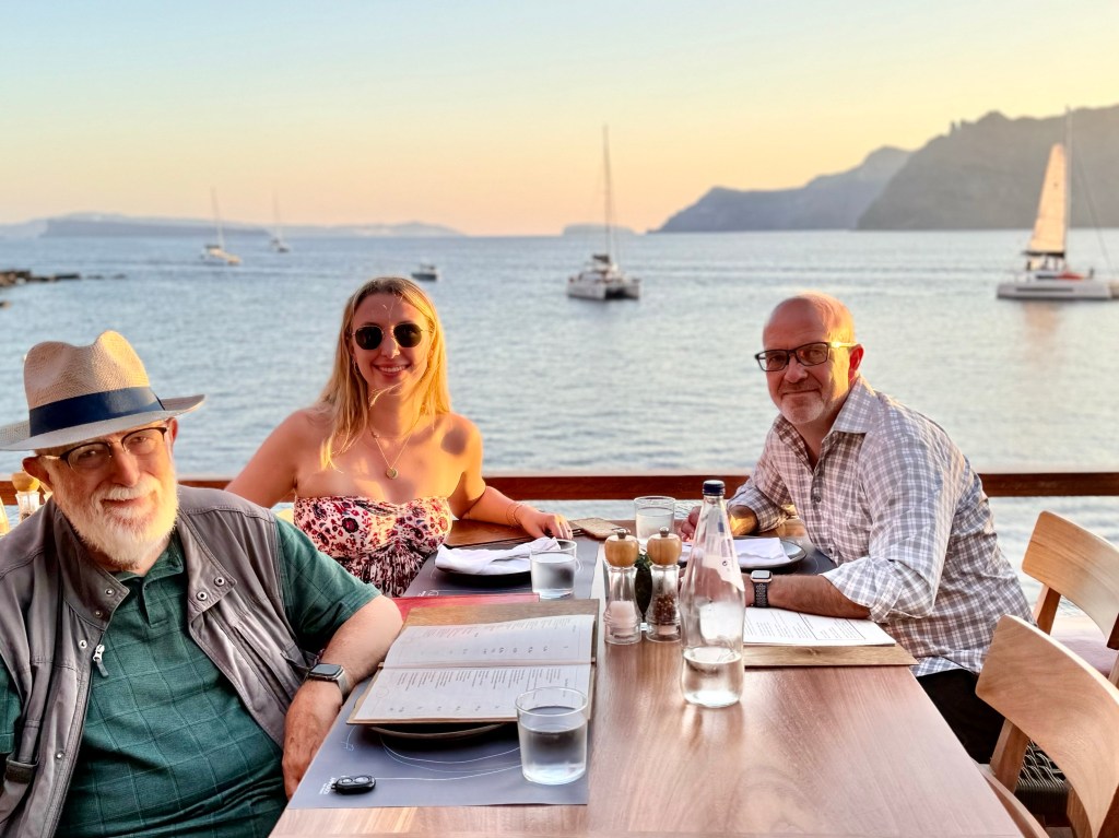 And then in the late afternoon they returned and we all went back down to the edge of the sea, this time by Uber, to a marvelous restaurant, Ammoudi, at the edge of the water where we had an outdoor table and watched the sunset and boats below us and had a wonderful and expensive birthday meal of seafood and red wine. And then after dark we came back up again by Uber.