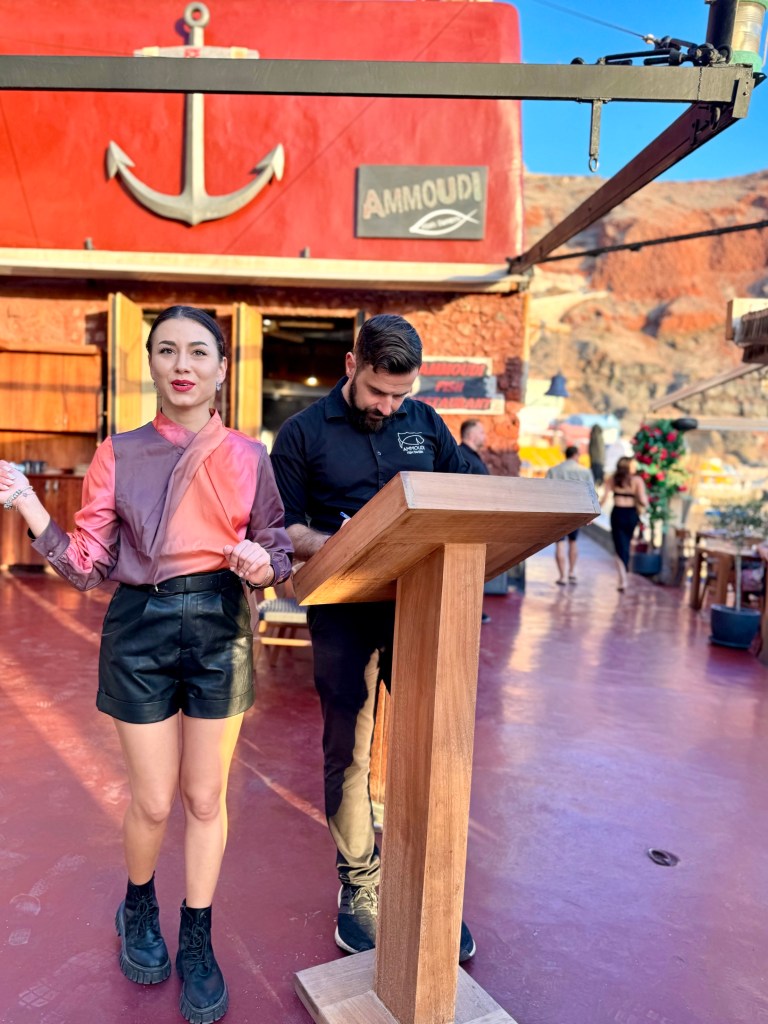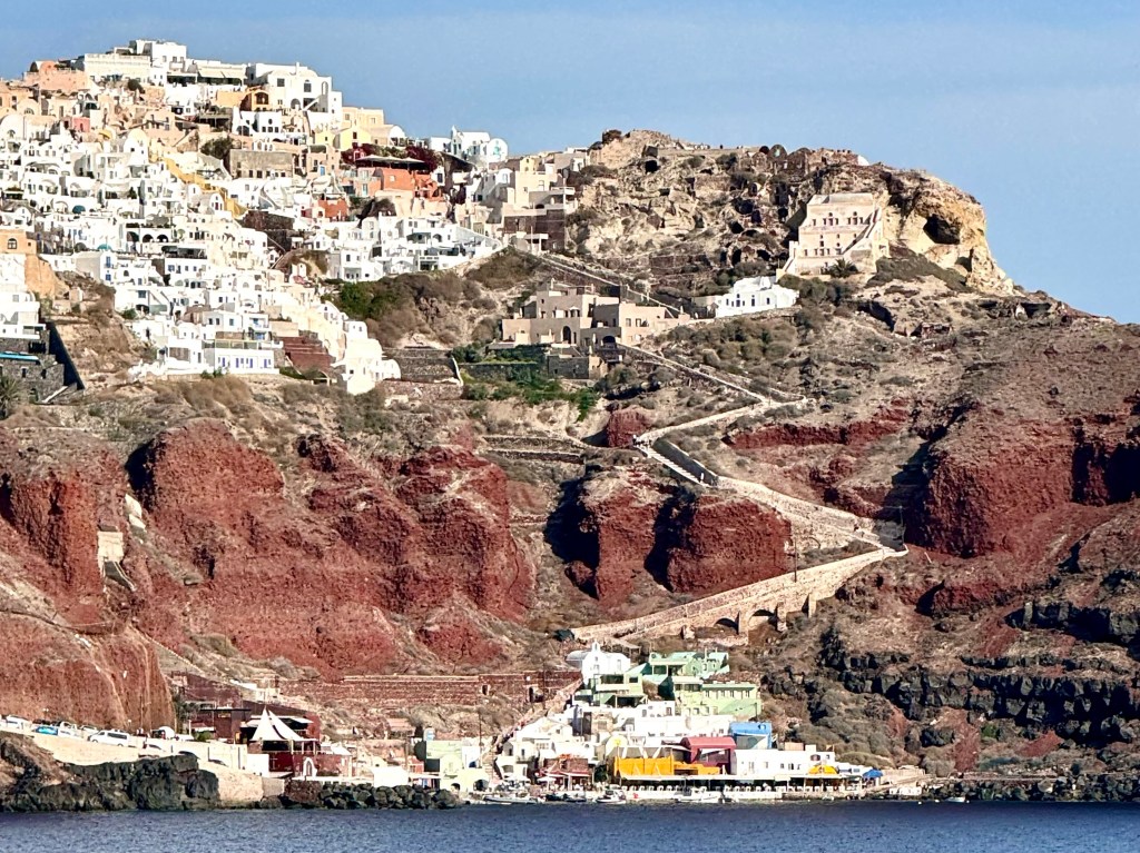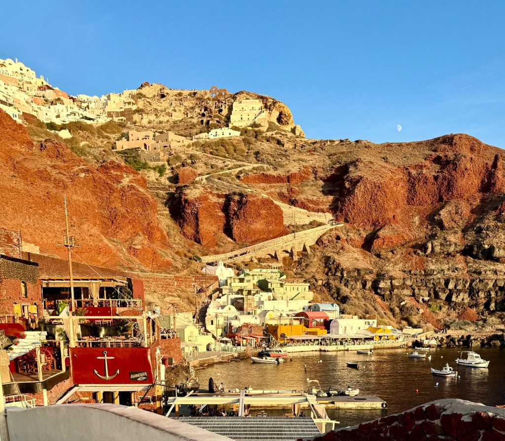 If you look closely at this photograph you can see the red cliff above the restaurant and the zigzag line of steps up the cliff to Oia perched on the edge of the volcano high above the restaurant.
