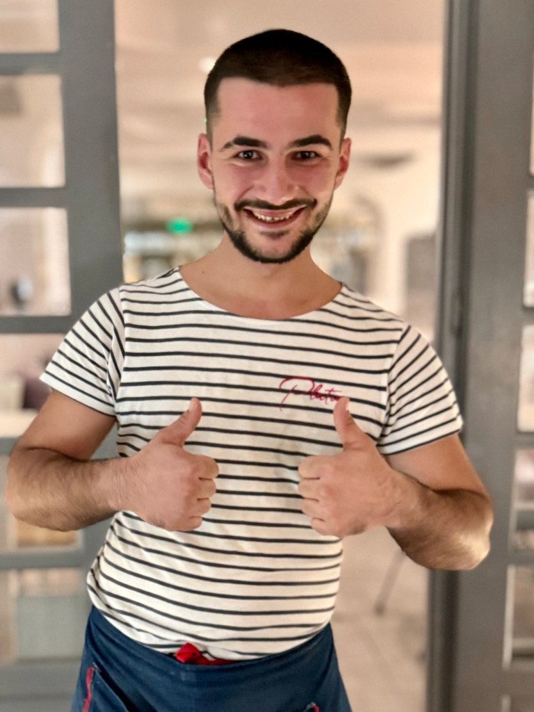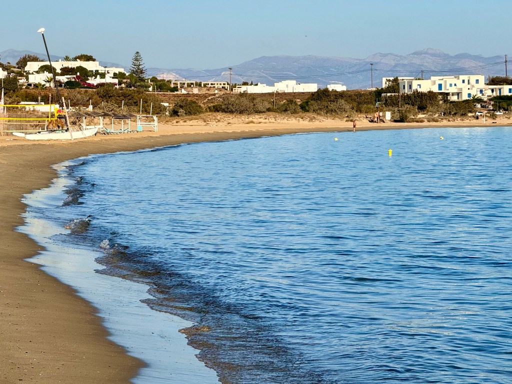 After a late breakfast Tom drove our red Skoda 30 minutes to Golden Beach, a long wide beach with the cleanest and finest sand of any beach we have been to. Instead of riding around the island for the day we rented padded recliners and sat on the beach drinking beer and eating cheese pizza for four hours before returning to Naousa. Then I napped and Tom and Caroline shopped before we went to the Italian place for supper where our waiter gave Tom a Mamos beer glass at no charge and I took his photograph.