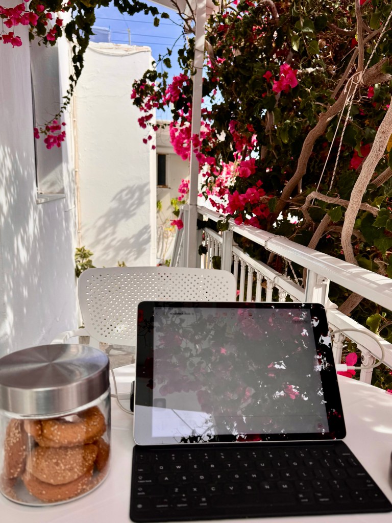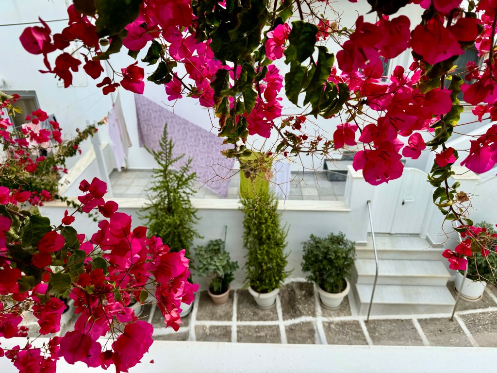 I spent the first morning on my own in my room at my kitchen table and then at the round table on the little white balcony outside my room above the narrow street that Efi’s Rooms is on. This narrow lane has several steps as it goes up the hill so no car or motorcycle can use it. They whiz by on the street that crosses about 100 feet down the lane but it is quiet here. And just as I had hoped, the morning was a completely ordinary morning filled with the sound of Efi talking to someone in her apartment and then talking to the older woman in the house across the street who was hanging clothes out to dry on a line in her courtyard.