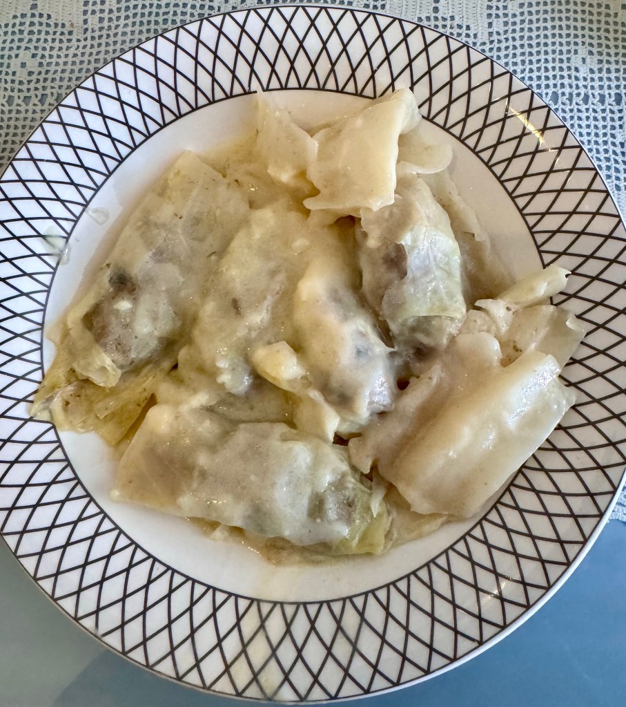 Tomorrow at 8:30 a.m. there will be a special celebration in the big church at the top of the hill to celebrate the life of Efi‘s mother, Olga‘s grandmother. The celebration is held 40 days after a person dies and the whole extended family will be here and I will get to meet them. Afterwards we will gather somewhere for coffee. Efi also wanted to let me know that she was bringing me lunch today. When I got back from the grocery store she brought to my room a bowl of cabbage leaves stuffed with minced meat. It was delicious.