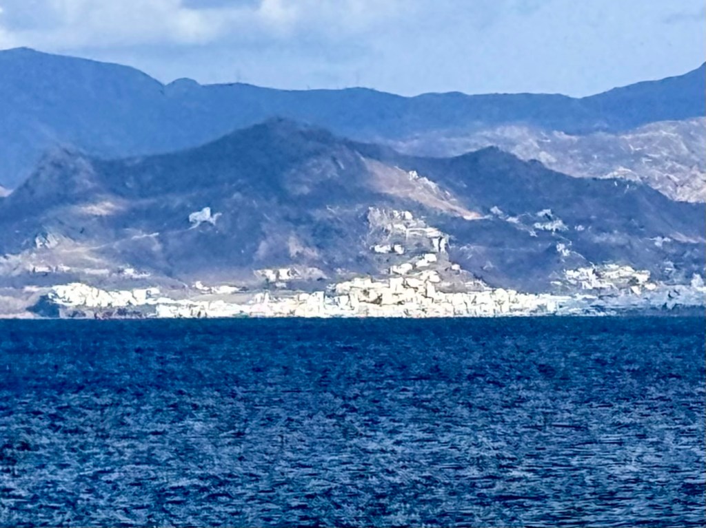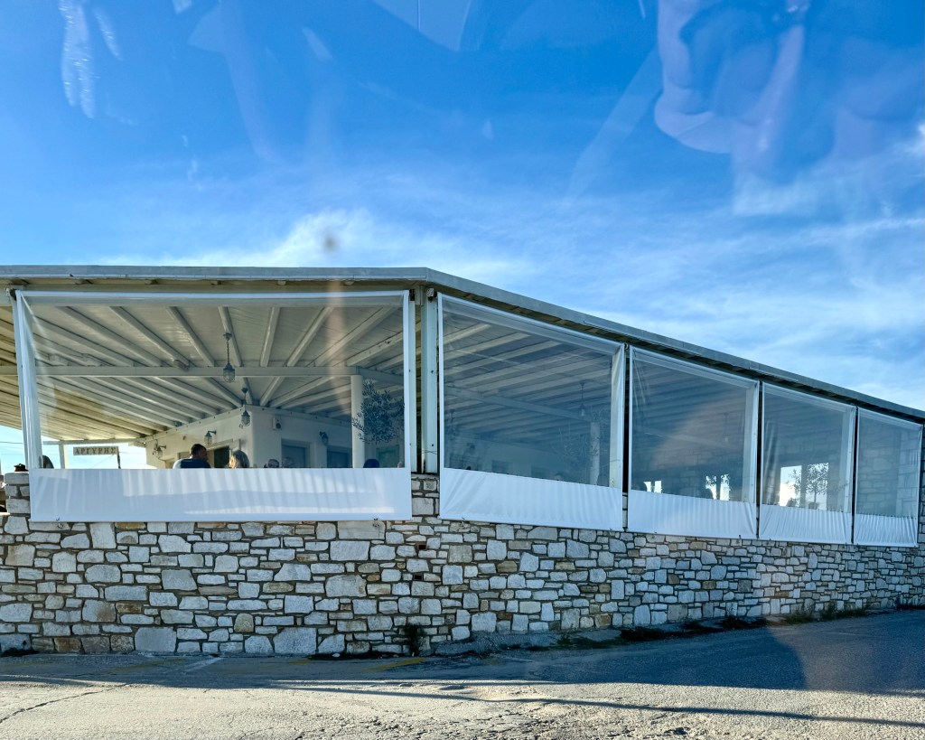 So at 1:30 we got in her car for the drive down to the harbor. But it wasn’t to the Naousa harbor, as I thought it would be, but across a ridge to another harbor town, Ampelas. On the way she pointed out the house of one brother, then another, then a cousin. We arrived at a beautiful harbor seaside restaurant that was filling with people and was full by the time we left. And Efi knew someone at almost every table. Everyone spoke Greek, there wasn’t a tourist in sight. Paros might close up to tourists on November 1, but thousands of people live here year around and many go to a restaurant on Sunday afternoon.
