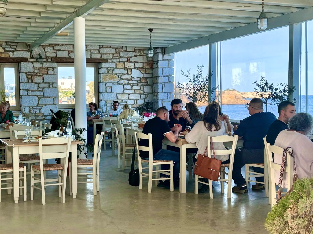 It was a beautiful sunny afternoon. The water was bright blue and across from us we could see the bright whitewashed houses on Naxos Island. The food was delicious. We had only one problem. We couldn’t say a word to each other. I tried to start a conversation by asking Efi how many children she had. She picked up her phone and called a translator. I asked her another simple question and she called a translator from the next table. Once in a while a friend from a nearby table would sit with us and talk to Efi in Greek. I wanted to talk, she wanted to talk, we couldn’t talk. But we could eat, which we did, and stared into space and enjoyed each other’s company.