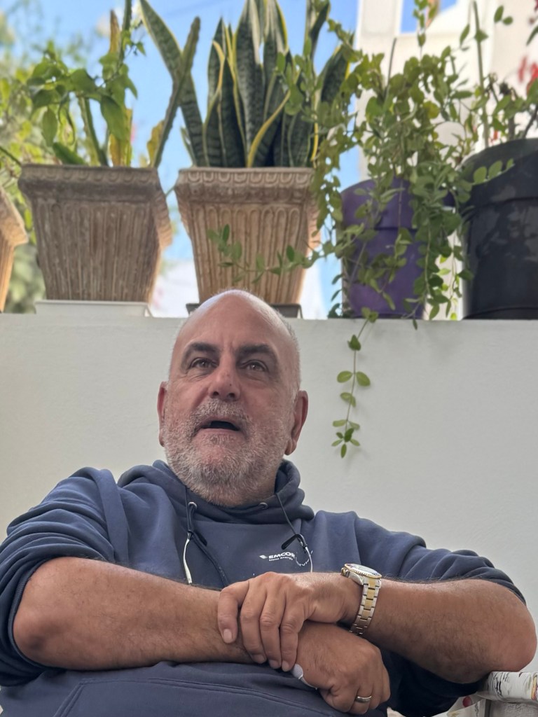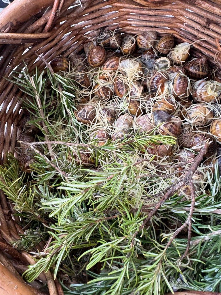 He brought Susie and me a bottle of his homemade Souma with a huge amount of ginger in it to bring back to the USA but we are guessing we couldn’t get it past security. And it turns out that he was the one who when it rained a few days ago collected the snails which come out after a rain and brought them to Efi in a basket filled with snails and rosemary. It turns out that before boiling snails you have to feed the snails rosemary to clear their gut of whatever nasty stuff they were eating. So the snails are in the basket eating rosemary and waiting for the moment that Efi and I boil and eat them. Susie doesn’t eat snails for some reason.