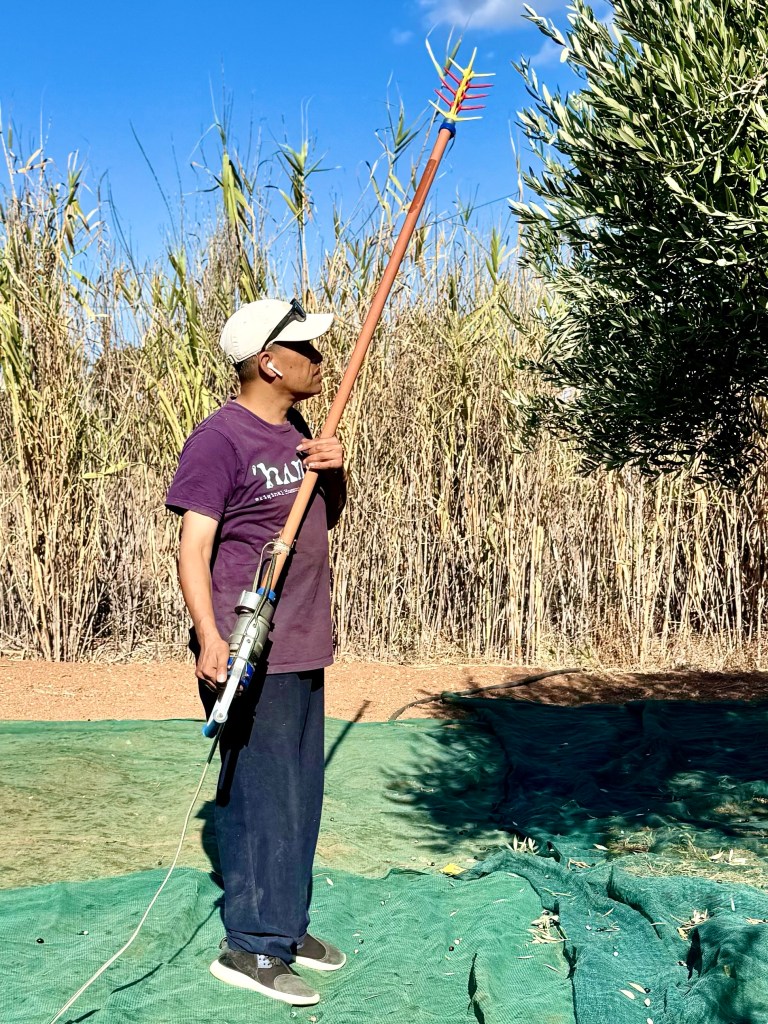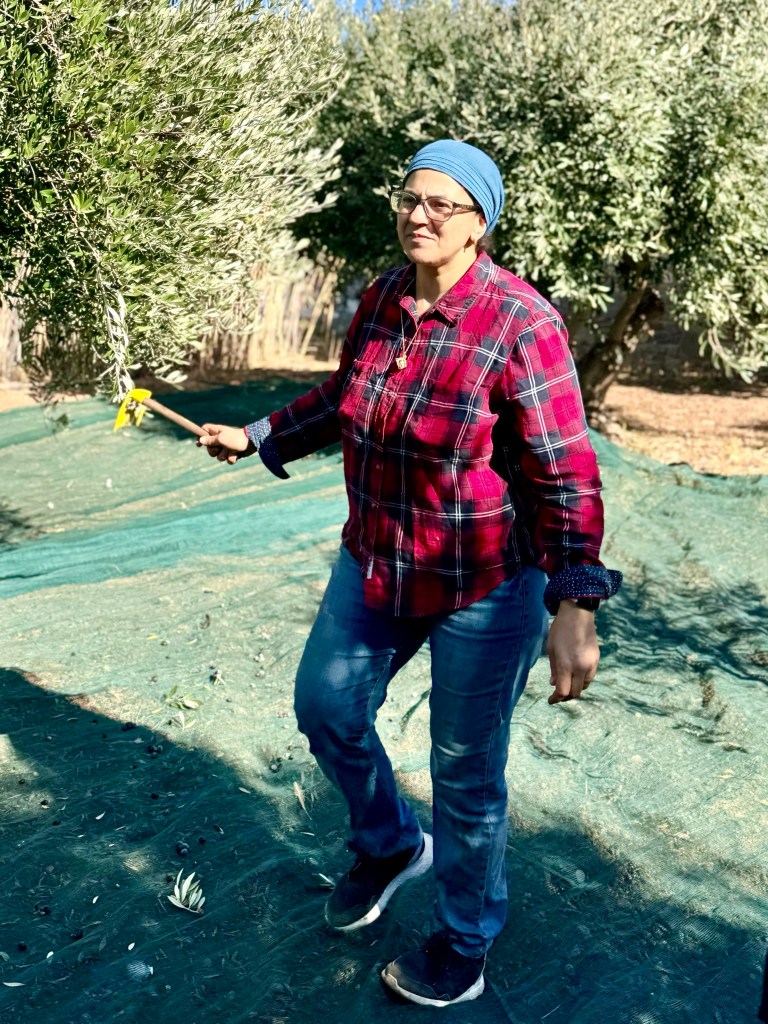 So we got to know Maya yesterday. Efi drove us to Ampelas, to the home of her brother, where Rassa, the Egyptian woman who cleans our rooms, was harvesting olives on a plot near Efi’s brothers house.