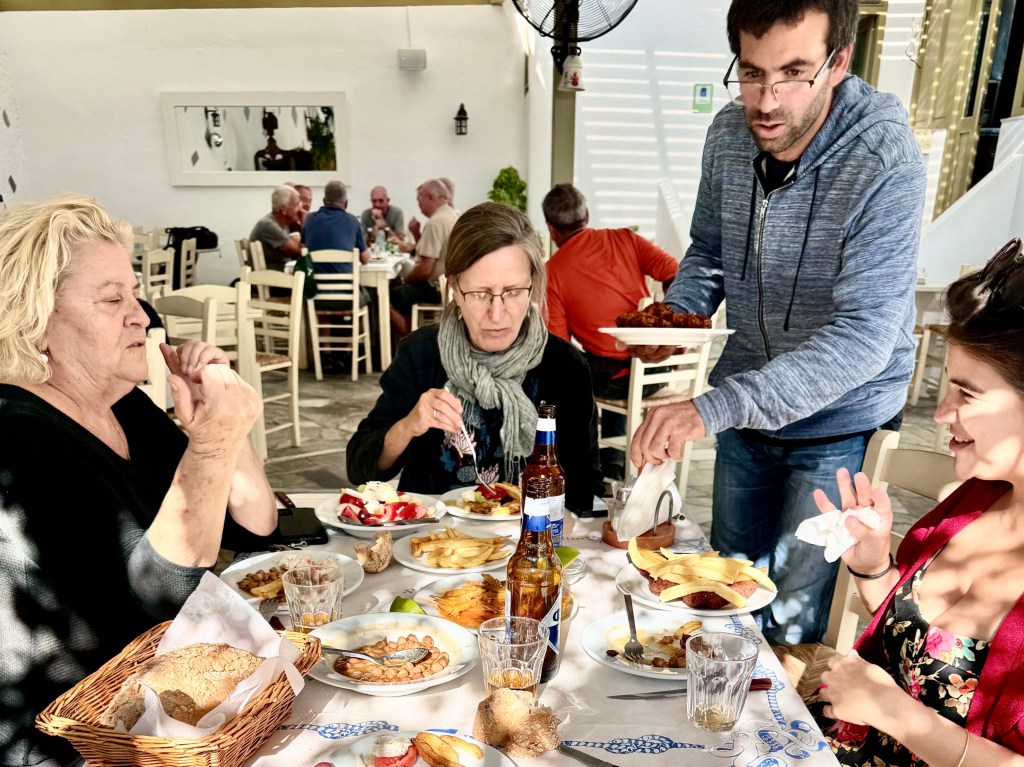 The reason for giving so much detail is so that I will remember it. But what the day illustrates is that the best experiences that happen when you are traveling, even when you are clueless, are not seeing historic buildings but when you luck onto some local experience and just go with the flow. The secret is that when you see an open door you walk through it, when you have a plan for the day and someone suggests looking at olives you drop what you are doing and look at olives. The reason that I was there in the first place is that I had on a whim two years ago clicked on a flight to Athens and on another whim selected and Airbnb with a blue roof and the Aegean beyond it. Those two chance choices led to Efi’s rooms and to being driven around the countryside of the island of Paros and meeting Maya the American falling in love with a Greek hotel owner. It was a marvelous day.