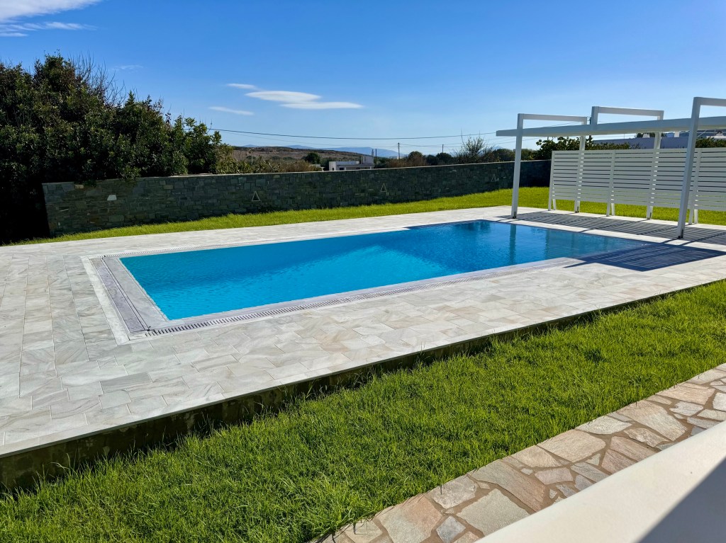 The method of harvesting olives is to spread large mesh cloth on the ground under the olive trees and then with a whirring electric arm with rotating plastic flapping pieces would knock the loose dark olives to the ground, sparing the unripe olives. Rassa’s husband operated the whirring plastic while Rassa and her son used small plastic rakes to rake olives from the trees. We didn’t know if we were going to become olive pickers for the day, but apparently not. After observing the olive orchard for a little while we sat on the porch of Efi’s brother’s huge and beautiful house with a blue and white swimming pool.