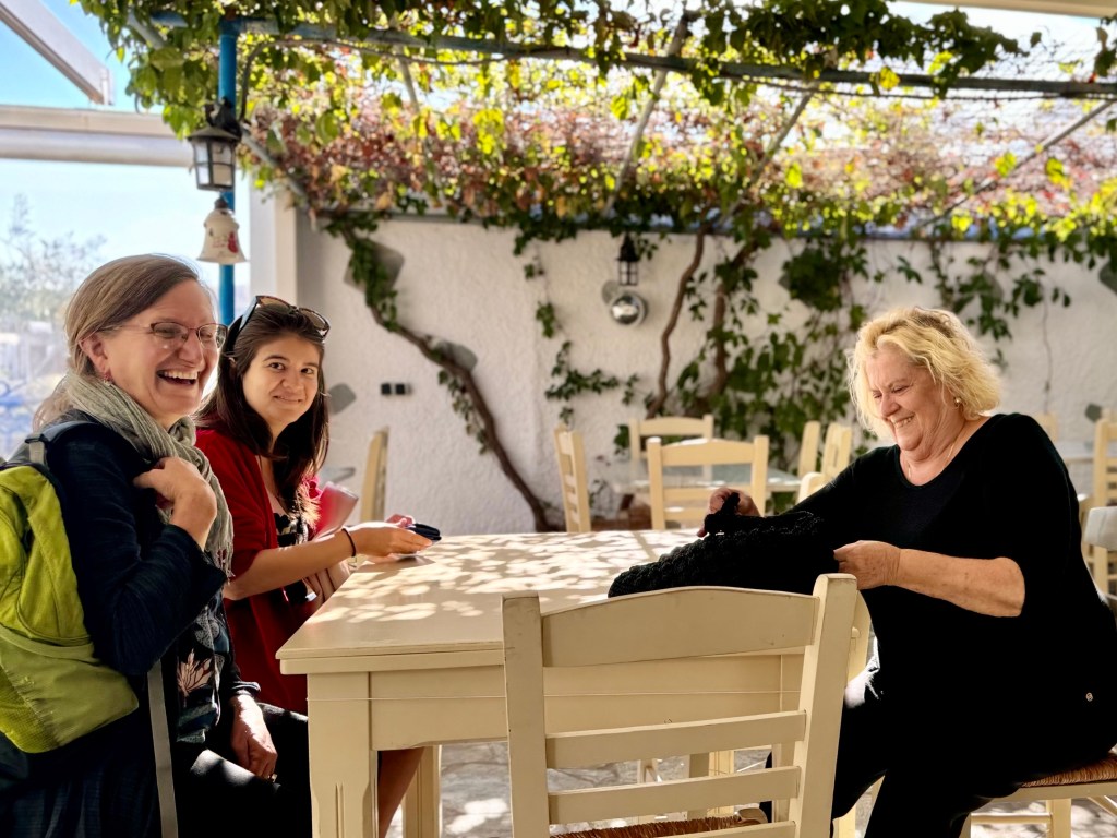 When Efi came downstairs she announced that we were all going to do something with olives. Maya, speaks just a little Greek, relying mostly on Google translate. which neither Susie or I have had experience with. It turns out that Maya on her last trip through an odd series of events which started with her sore feet had met a Greek guy and was smitten. The Greek guy then visited her in the United States and on this trip she was staying for a month with him in a hotel that he owned in Parokia where the ferries dock. She is going home to the United States in three days and had just dropped by to see Efi. We are discovering that Efi has all kinds of foreigners who are attracted to her including the German, Wolfgang, who both Maya and we know from previous trips. Maya has lived and studied in Paris and counts Paris as also being home. She works remotely doing translations from French to English and tutoring on line in the United States. At the end of the day she had to rush back to Parokia to start her lessons which started at 9 a.m. in the United States. 4 p.m. in Parokia. Working remotely lets her travel.