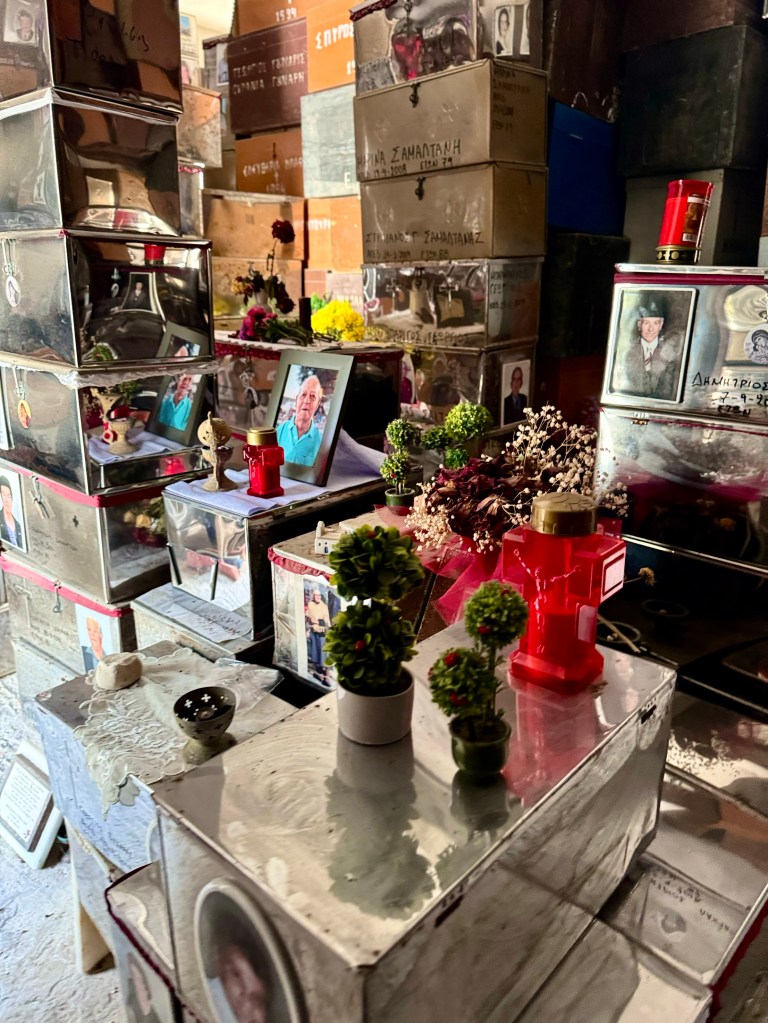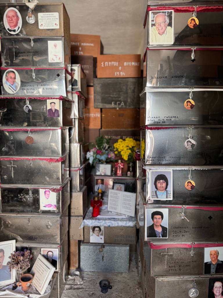 And then Susie an I went to the graveyard behind the church and she showed me a room full of silver boxes piled high with photos of people in front of them. Could these be ashes? We’ll have to ask someone.