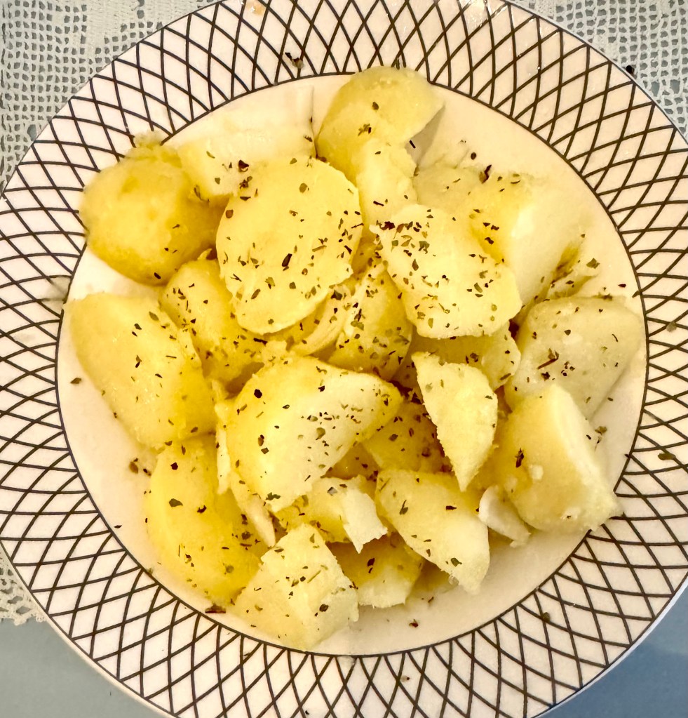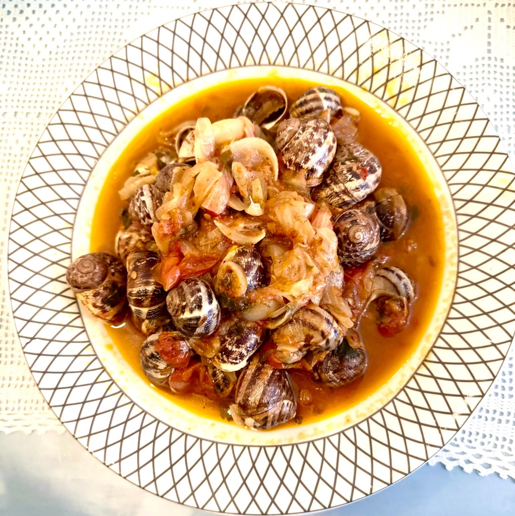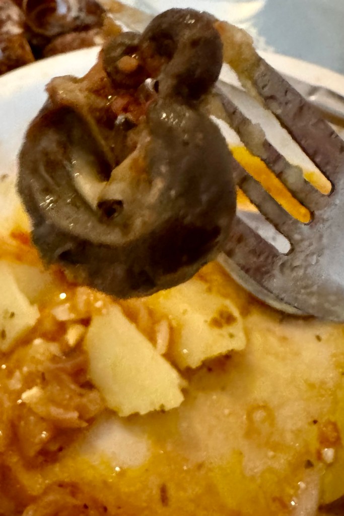Efi was cooking. Today we would have snails. Efi brought us up a Greek salad, a plate of boiled potatoes for Susie who is a non snail eater, and a bowl of snails in a tomato sauce for me. With a knife you hook the snails and then they come out whole. They were delicious.