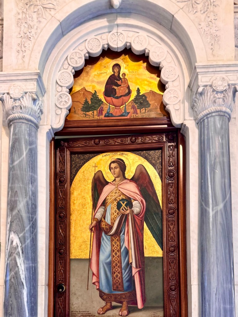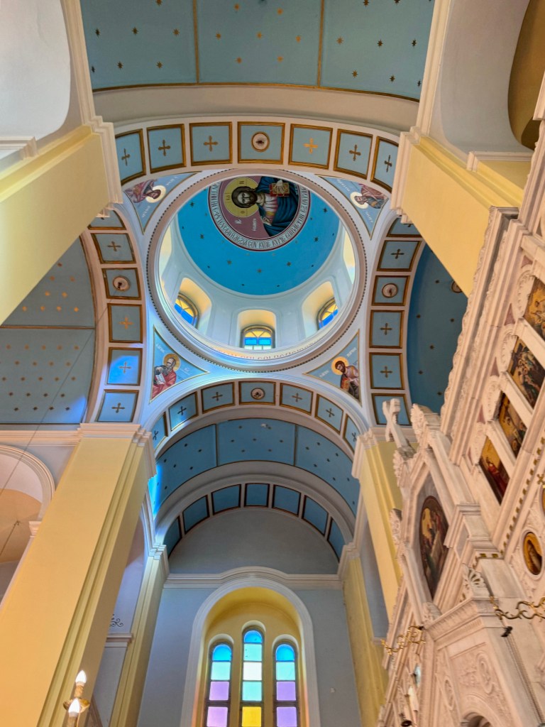 We wanted to go to the Greek Orthodox Church at the top of the hill today but didn’t know when the service started. We discovered at 8:15 that it started at 8, but we went anyway. We got there at 8:45 and there were about 15 people there, but by the end of the service at 9:45 there were at least 25. We weren’t late after all. Women kept coming in and walking to the front, pausing in front of some of the paintings and seeming to kiss the small painting in front of each painting. This was while the service was going on. There was one priest out of sight in front of us behind a pillar and the older priest, that sat with me mute at the memorial service coffee two weeks ago after the service, who officiated. There were two altar boys in red robes.