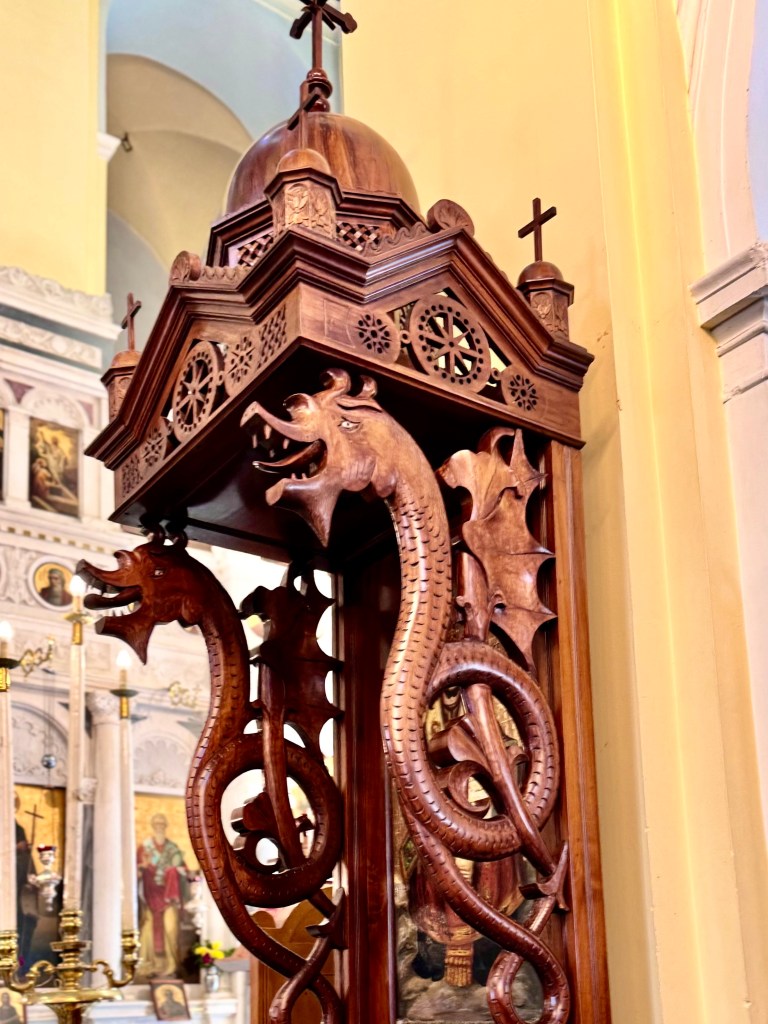 Again, the audience was simply the audience and took no part in the service. Again the entire service was beautiful sing songy chanting and ritual, often taking place in the inner chamber and out of sight. At the very end children, who appeared with their parents at the end of the service, were given bread and a sip of something. Then the adults came forward for bread and as soon as they took the bread and turned back the service was over and then began talking to each other.