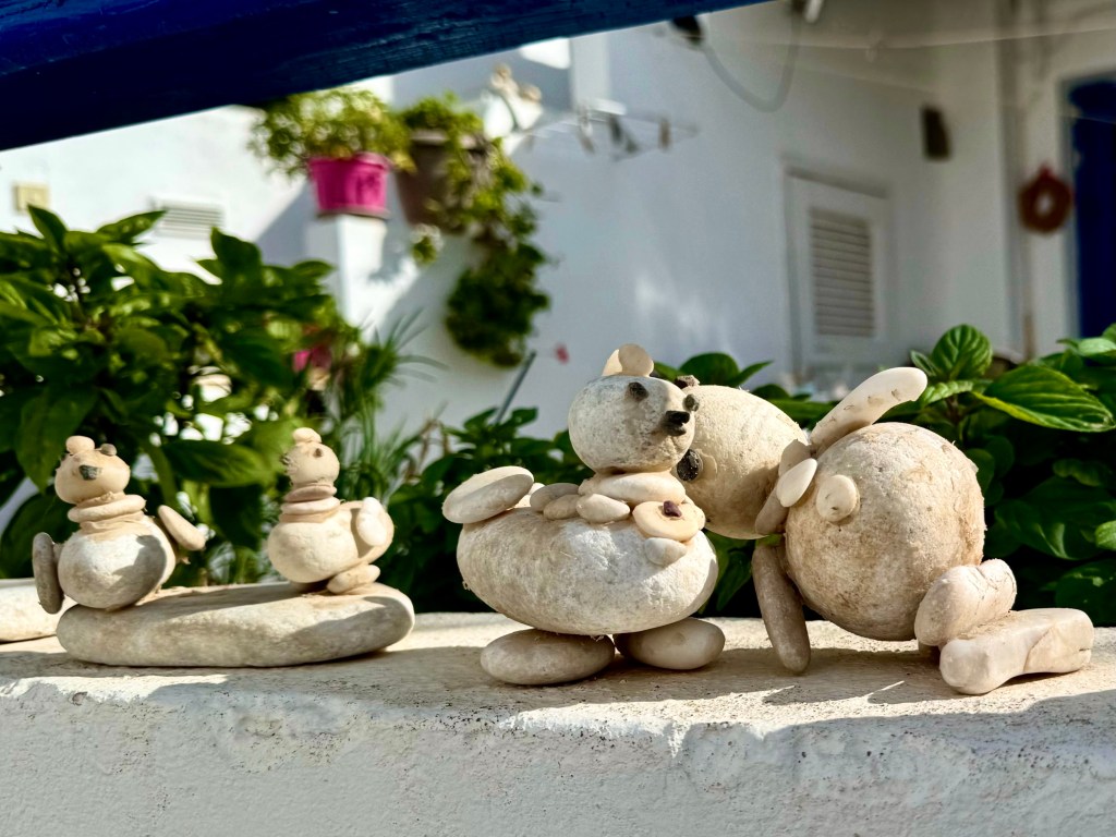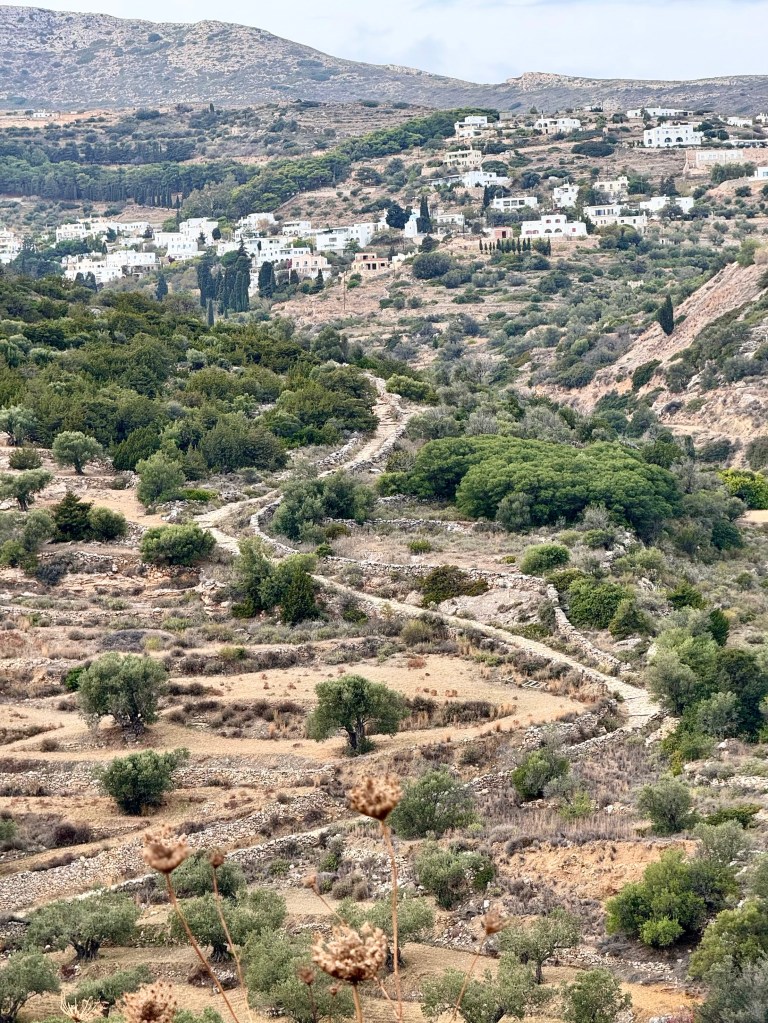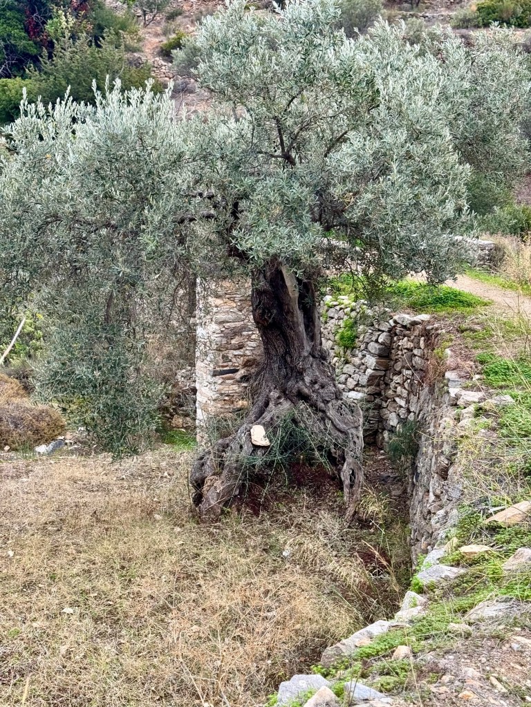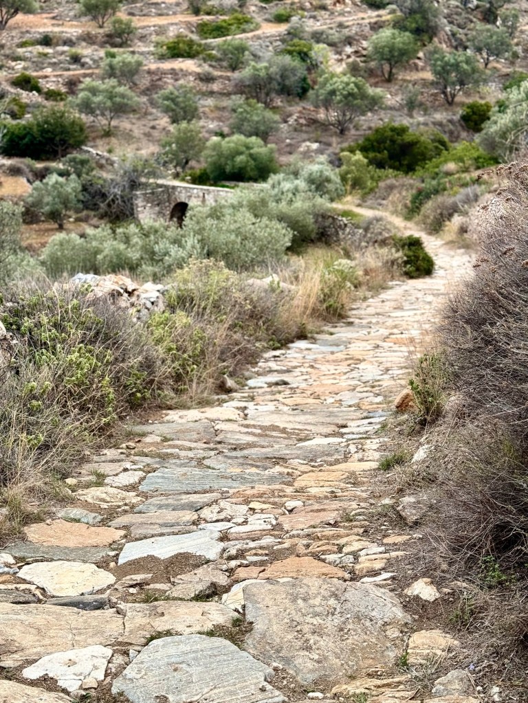 Wednesday was another sunny day so we took advantage of it to hike down from Lefkes to the coast at Prodromos. The road was rocky and slippery and narrow, paved with multicolored rocks that looked as if they were part of the original 1000 year old Byzantine Road from the coast up to Lefkes. We had the feeling of going back in time, joining people who were going to and from Lefkes, probably taking goods on muleback, long before the motor road that paralleled the Byzantine Road in the same long valley down to the sea. The landscape on both sides of the path was lovely shades of green and gray and yellow pastel shrubs and grey green olive groves.