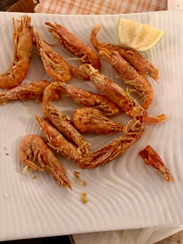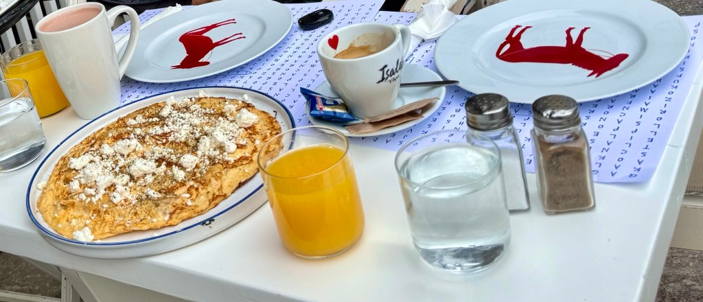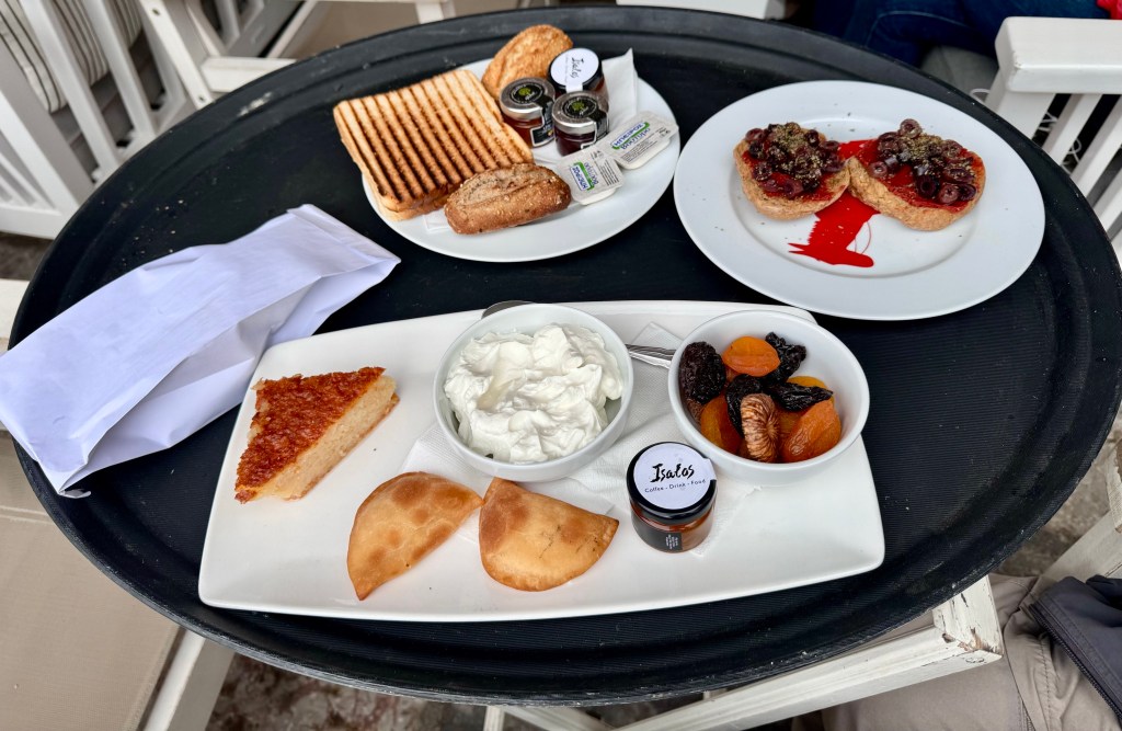 This morning we had breakfast by the harbor and ordered the special Greek breakfast for two, since we expect to only have one breakfast here. We had a marvelous farm egg with lumps of potato omelette, tomato paste and olives on freshly baked bread, fresh squeezed orange juice, hot chocolate, Greek yogurt with honey, dried fruit of several kinds, toast, butter, jam and orange cake for dessert. It was $20 apiece and worth every penny. At Efi‘s I had muesli and milk daily for breakfast, probably $2. Tuesday night we sat in a family taverna with four tables and two other sets of diners eating a delicious Greek salad, almost all homegrown tomatoes, and for the first time in my life I ate fried shrimp. The crunchy pink shrimp were fried crisp whole, with a antenna and legs and head included. I asked the cook how to eat them and he said I could crunch them down whole, head to trailing legs, but that some people preferred not to eat the heads with the shiny black eyes. So I followed his suggestion and found that while they tasted delicious and I liked the crunchiness that after I had chewed for awhile the last little bit of debris was hard to swallow, so I put it on the plate with the heads.