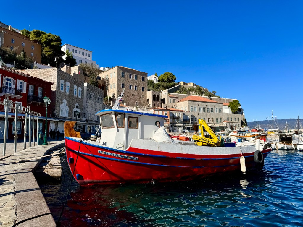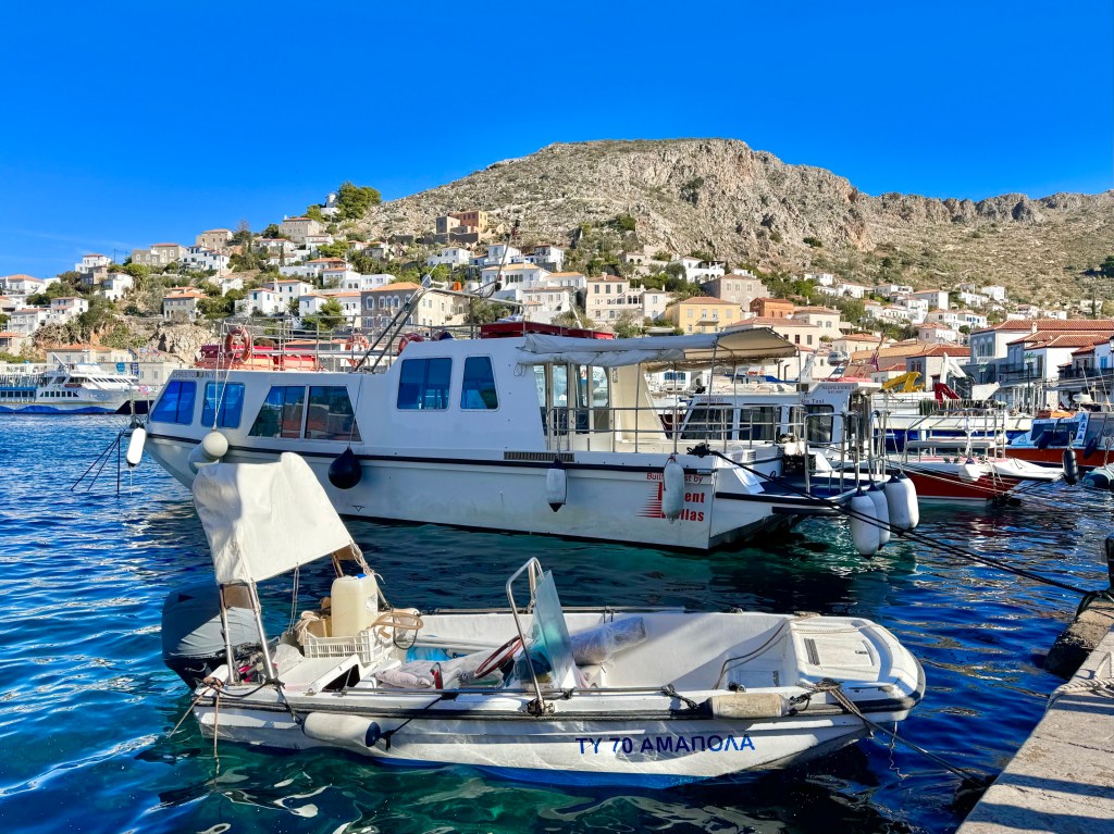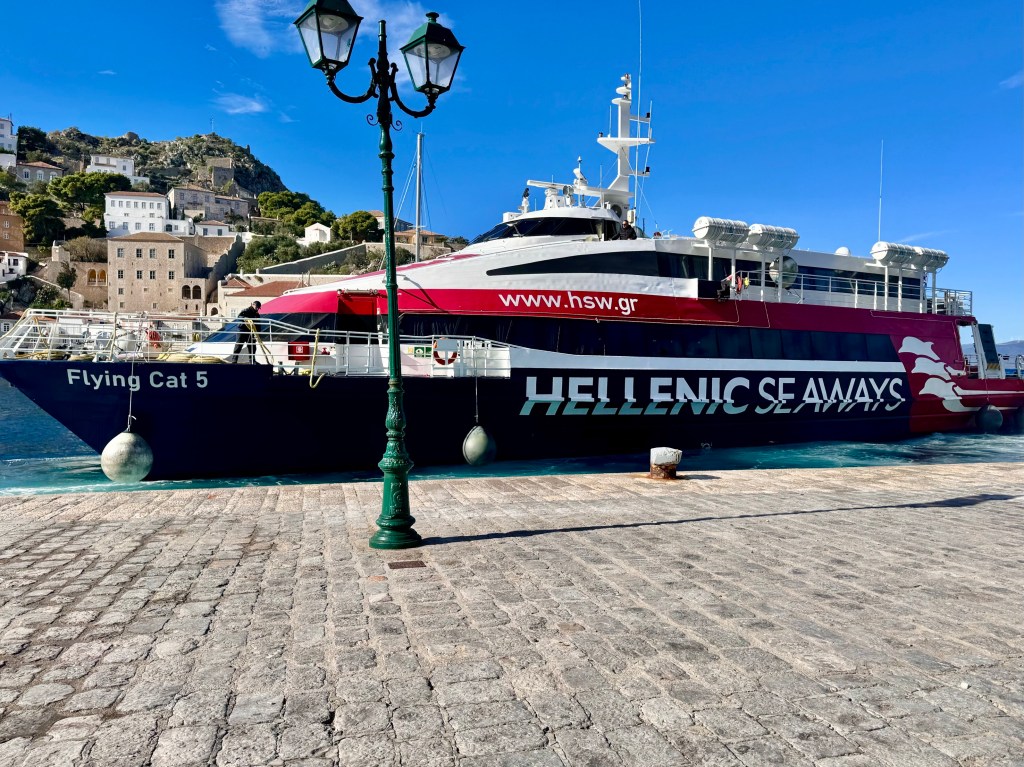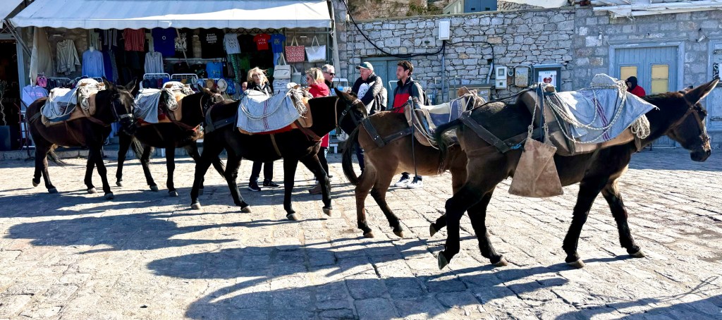 So we tried to come here by ferry on Sunday, but all ferries stayed in port. We left Athens at 9 on Monday morning and had a great time on Monday walking around. Now on Tuesday we have learned that the ferries were kept in port today by high winds and wonder if we will be able to get back to Athens by Thursday morning when our unchangeable cheap flights fly out. We‘ll see.