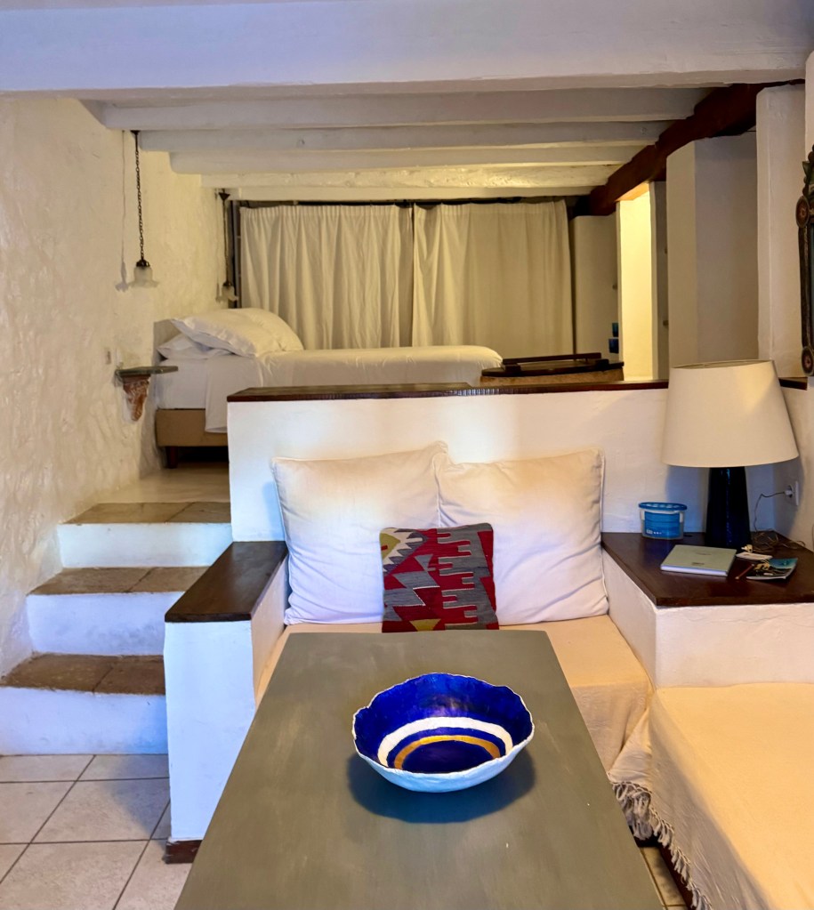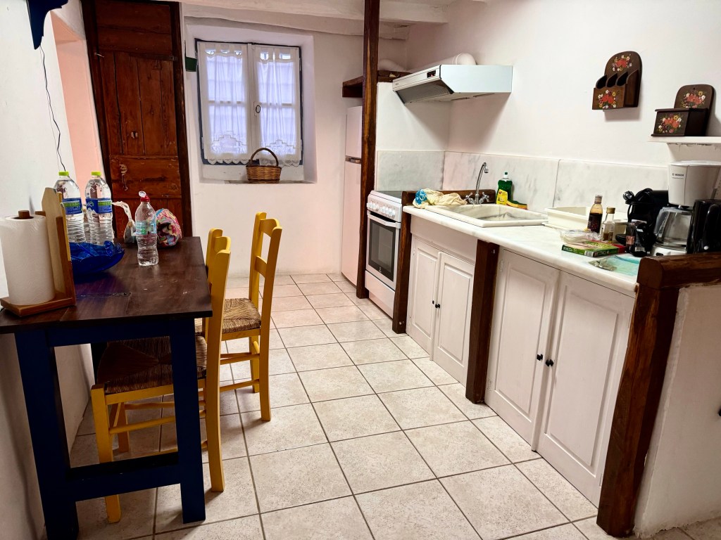 I am also realizing that there I am caught between the two ways of travel. The simplest and the cheapest way is to rent a place for a month where you can buy groceries and cook yourself and not spend money on any activities. The second way is to spend a short time in a place and spend money on gaining every experience you can including eating out since you are here such a short time. Our Airbnb is more expensive and much more lavish, an exquisite cave in the hill surrounded by bougainvillea with a full kitchen which we haven‘t used at all. At Efi‘s I heated food on a single hot plate.