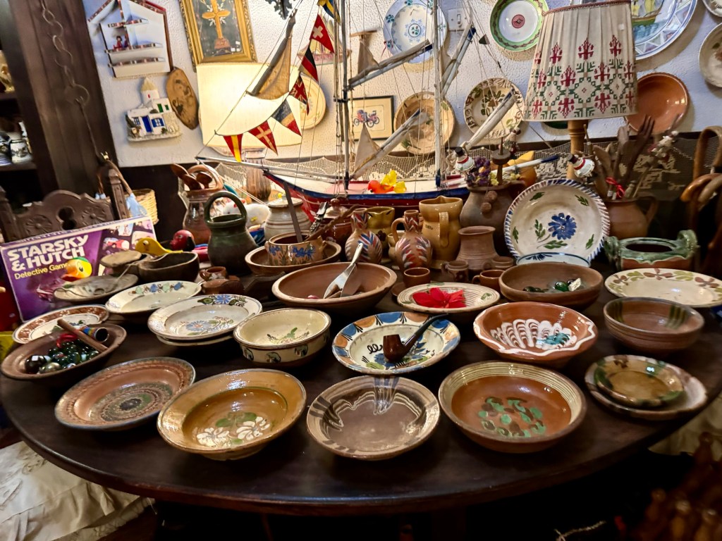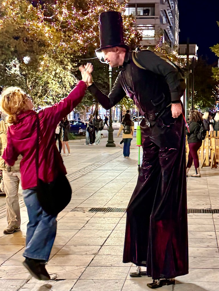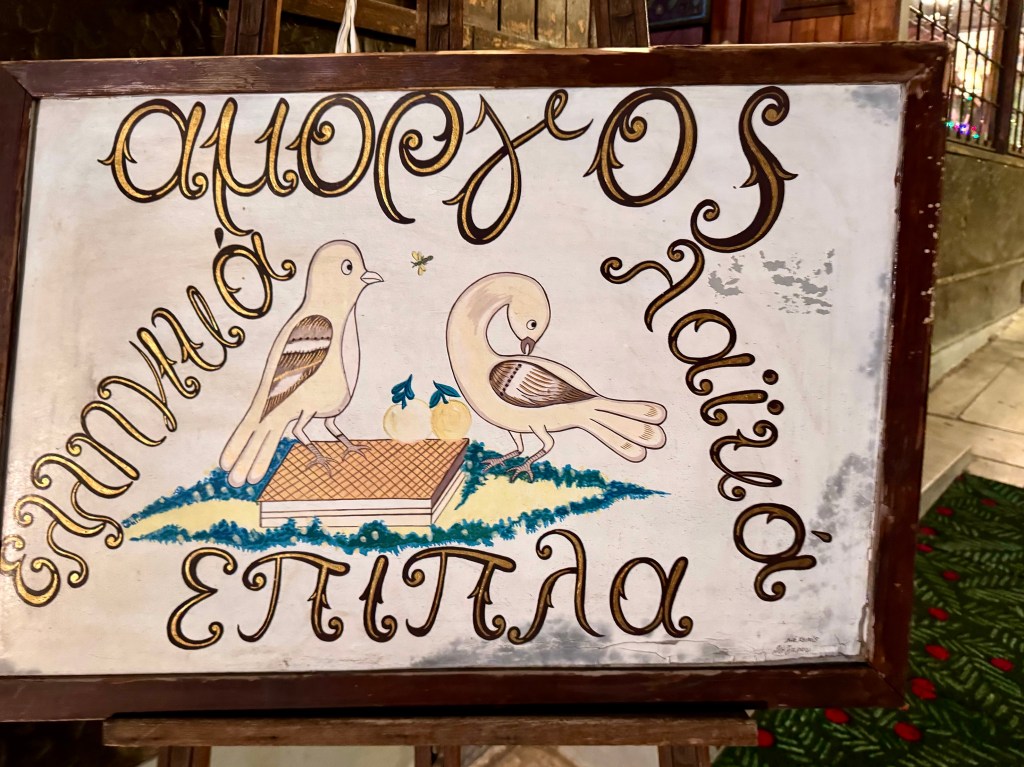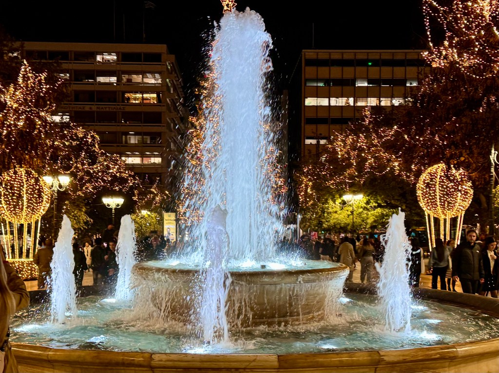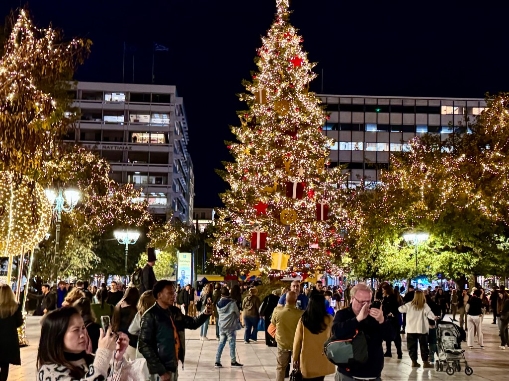 After our ferry docked and we rode the metro to Syntagma Square it was beginning to be dark. In the two days since we were here the square was festooned with Christmas lights and decorations. We walked to the Acropolis View Hotel and were in time to look through the marvelous antique store across from the hotel before going to bed early to prepare to be up at 2:30 to go to the airport.